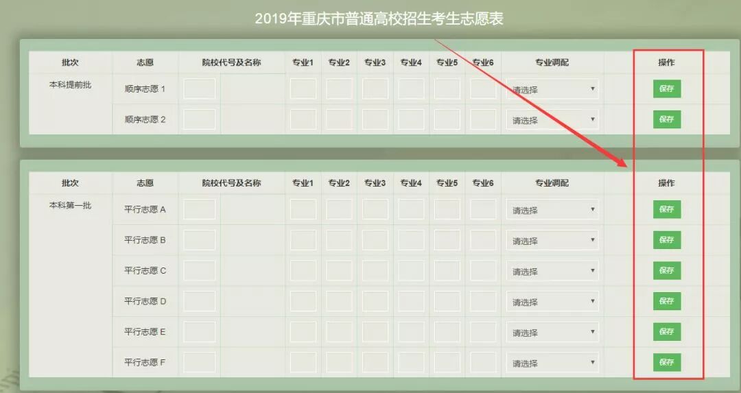 ✪ 请按志愿卡排版顺序逐条依次填写志愿,填写一条志愿时,需输入相应的“院校代号”和“专业代码”,点击保存,此时系统提示志愿保存成功,即表示一条志愿填写完毕。