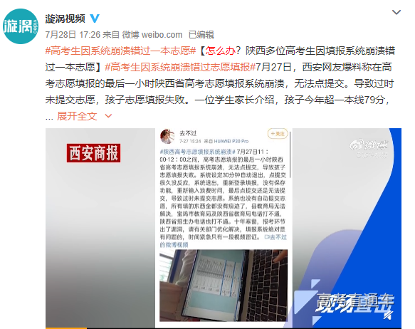 2020年陕西省普通高校招生第一次志愿填报于7月24日12:00开始,7月27日12:00结束,共72小时,与往年时长相同。 本次填报提前批次、单设本科批次、本科一批、普通高校职业教育单独招生志愿,共有122455人填报志愿(去年同期119557人)。 志愿填报期间系统一直工作正常。 网友称志愿填报最后一小时系统崩溃 据西安商报漩涡视频报道,7月27日,有西安网友爆料称,在高考志愿填报的最后一小时陕西省高考志愿填报系统崩溃,无法点提交,导致过时未提交志愿,孩子志愿填报失败。一位学生家长介绍,孩子今年超一本线79分,但却因此错过了一本填报。 报道称,也有其他考生遇到类似情况,家长已经联系相关部门: