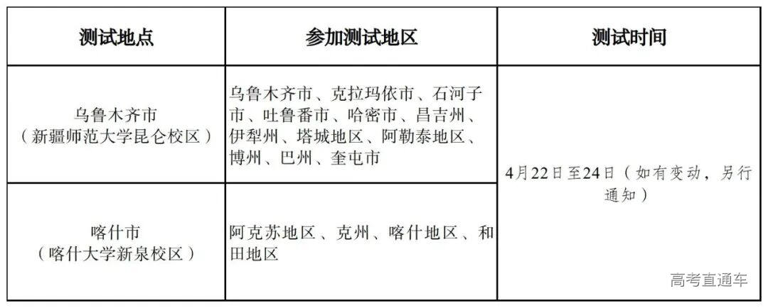 新疆2026年普通高等学校招生体育类专业测试(以下简称“体育测试”)工作拟于2026年4月22日至4月24日(如因天气原因等临时有变动,将另行通知)分别在乌鲁木齐市、喀什市两个测试点进行。网上报名和缴费工作于2026年4月7日12时开始,4月10日18时截止,报考2026年体育测试考生请勿错过。