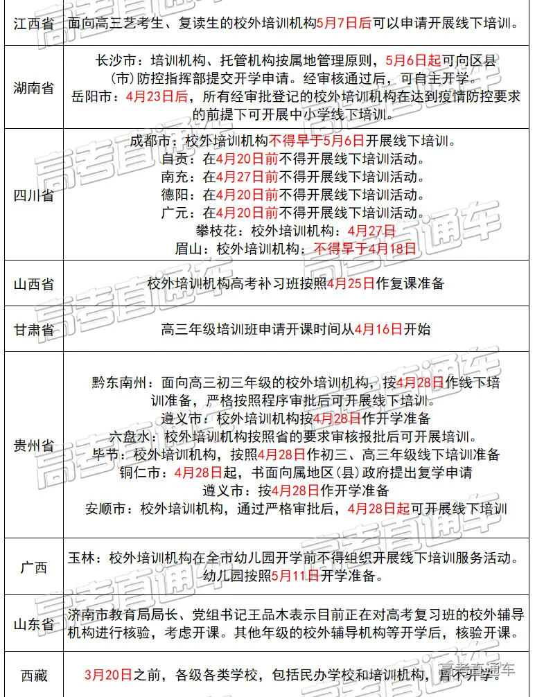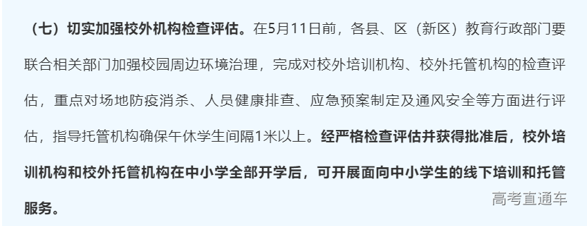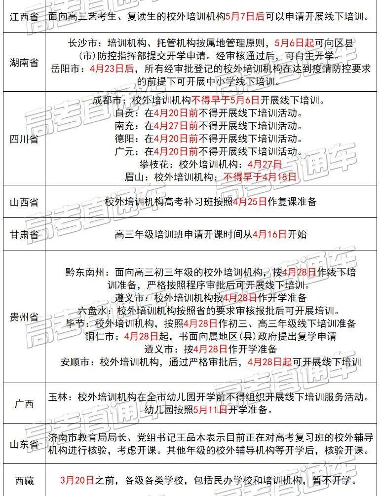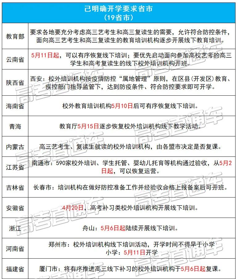 江西省提出,面向复读生的校外培训机构5月7日后可申请开展线下培训,由所在地教育行政部门会同卫生健康、市场监管等部门逐项检查验收,在符合防疫条件标准、确保学生安全的前提下,可以开学。
