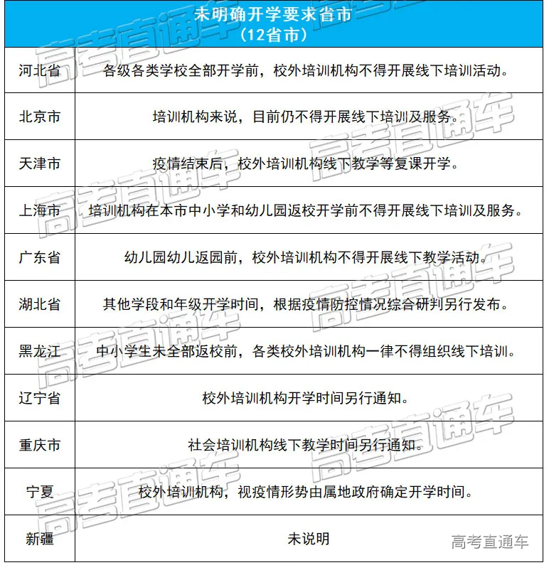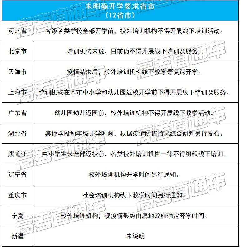 此前,多省区市出台的复课文件明确表示,校外培训机构在中小学校全面开学复课前不得开展线下培训活动。尽管已有省份允许校外高考补习班复课,但更多的地方还未出台相应政策,很多复读生和家长心急如焚。