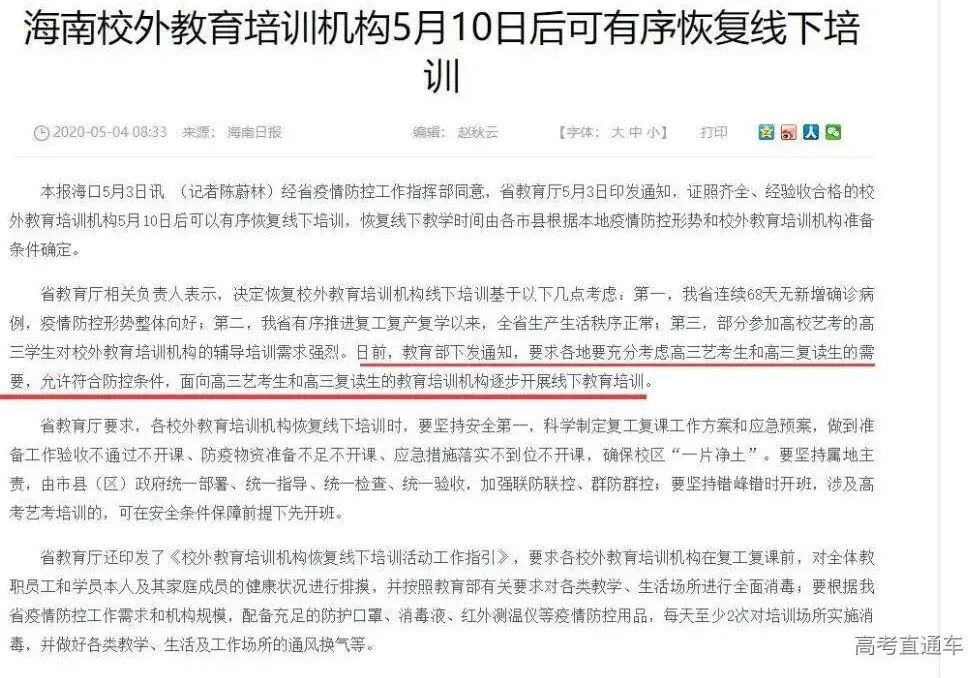 日前,教育部下发通知,要求各地要充分考虑高三艺考生和高三复读生的需要,允许符合防控条件,面向高三艺考生和高三复读生的教育培训机构逐步开展线下教育培训。