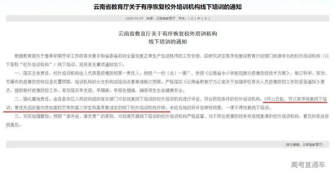 5月7日,云南省教育厅发布关于有序恢复校外培训机构线下培训的通知。今日起,可以有序恢复线下培训;要优先启动面向参加高校艺考的高三学生和高考复读生的线下校外培训机构开班。未经当地政府评估审核同意,一律不得恢复线下培训。