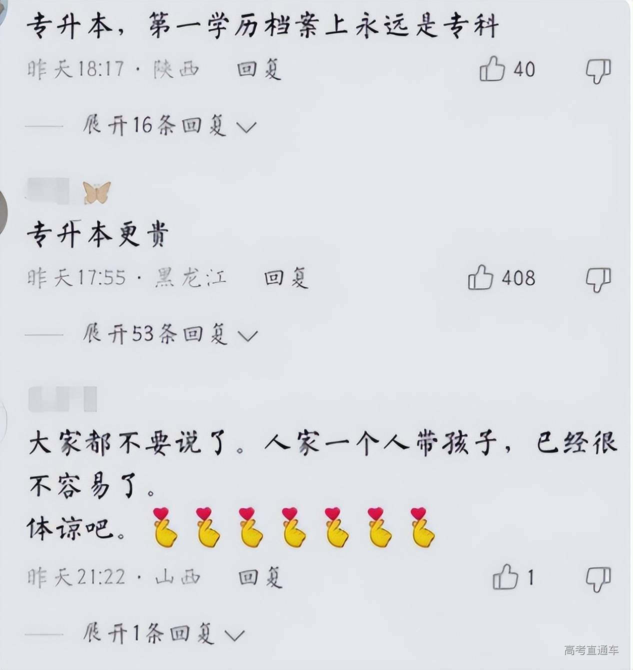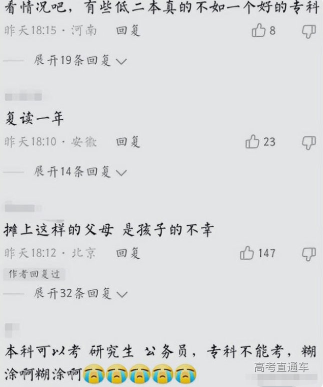 也有很多网友说家长目光太过于短浅了,即便是借钱也应该供孩子上本科,这样将来孩子才能有出息,上本科是一件利大于弊的事情。