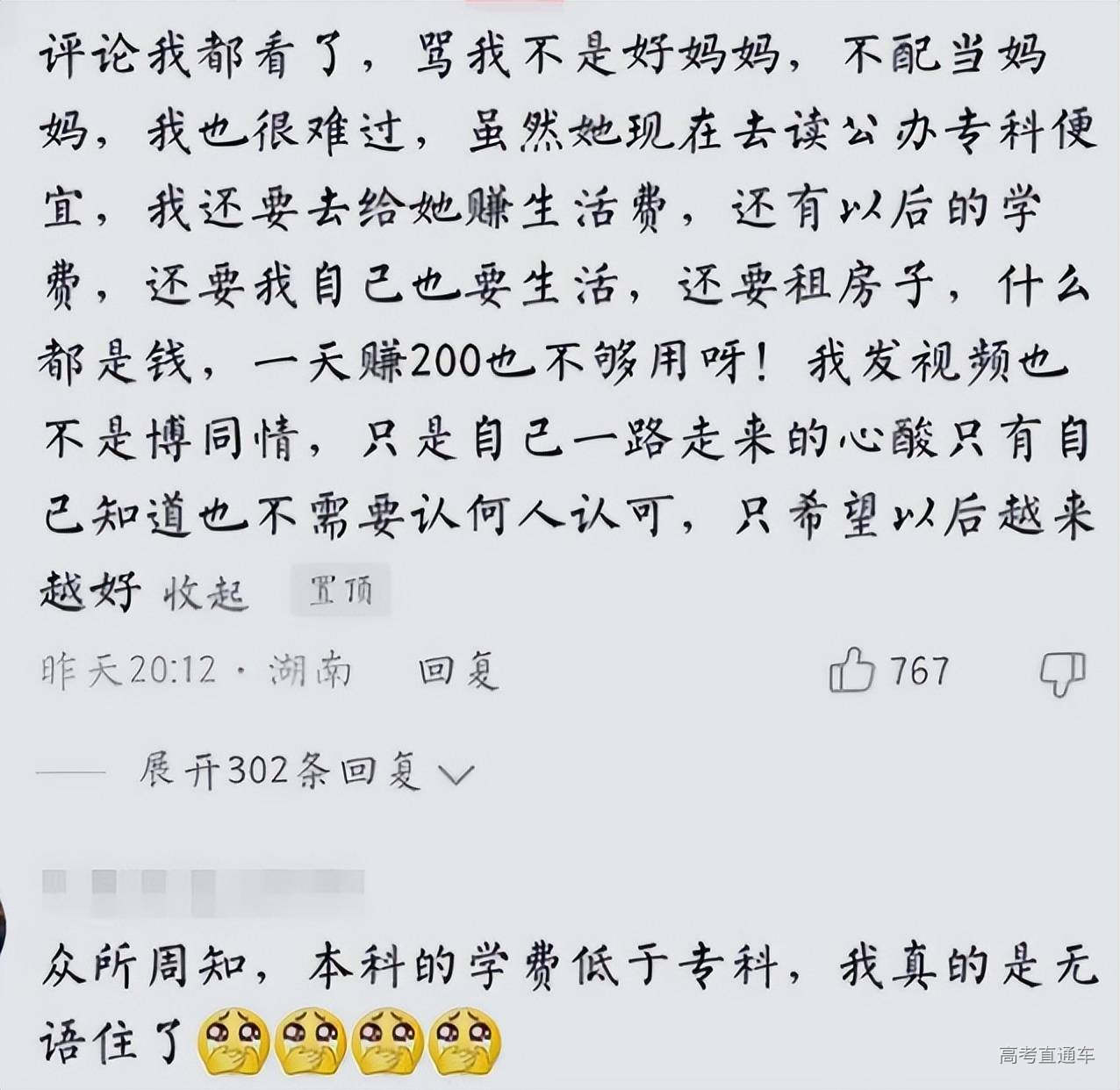 母亲在舆论的裹挟之下又做出了回应,她表示不是自己不想供孩子念书,也不是发文博同情的,只是觉得孩子好不容易考上的二本,自己却没能力供,心里也很难受。