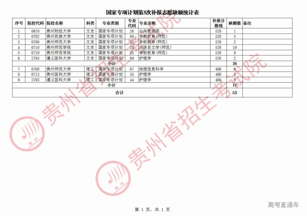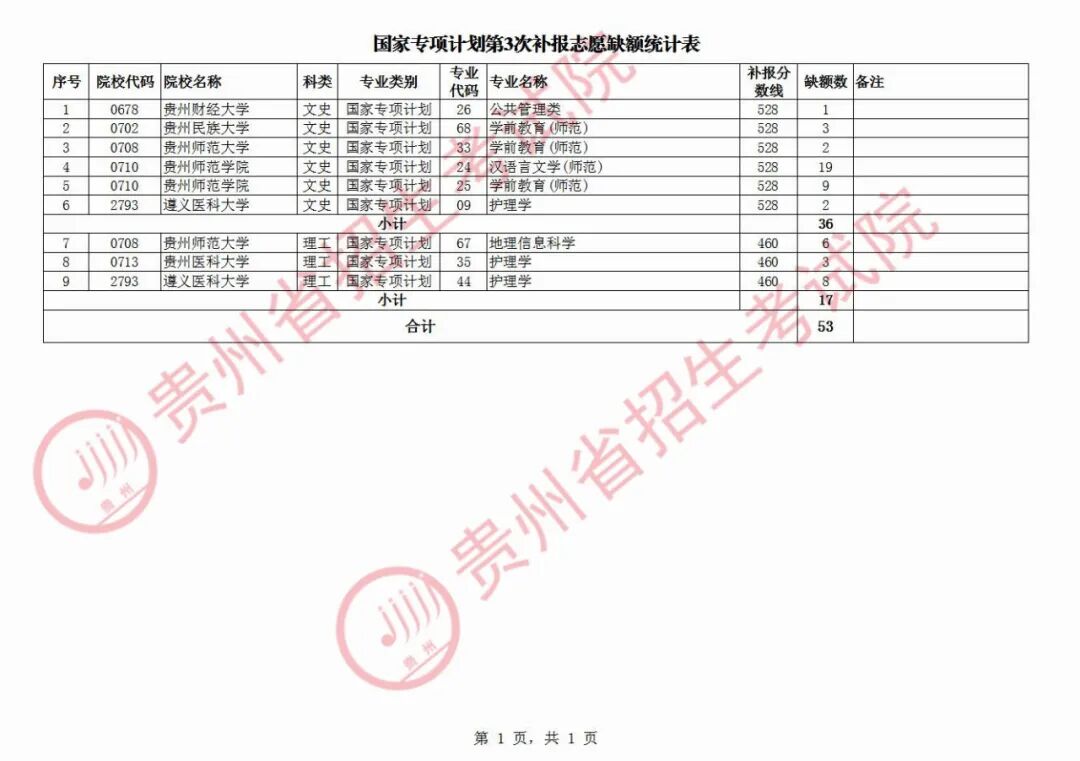 二、国家专项计划报考资格审查合格且分数达到要求的未被录取考生,可根据附表公布的缺额情况补报志愿。考生补报时请仔细查阅《贵州省2020年高考高校招生专业目录》和院校招生章程了解各院校招生专业的特殊要求。