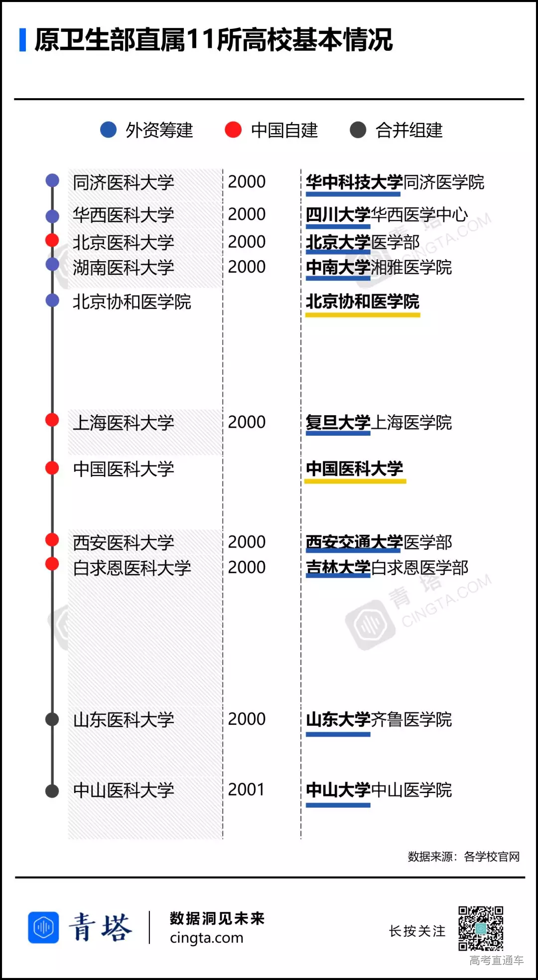 世纪之交,由于卫生部不再直接管理高校,医科大学的“国家队”,原卫生部直属11所医科类院校也面临着艰难的选择:与当地综合性大学合并,或者将管理权下放至地方,成为地方高校。