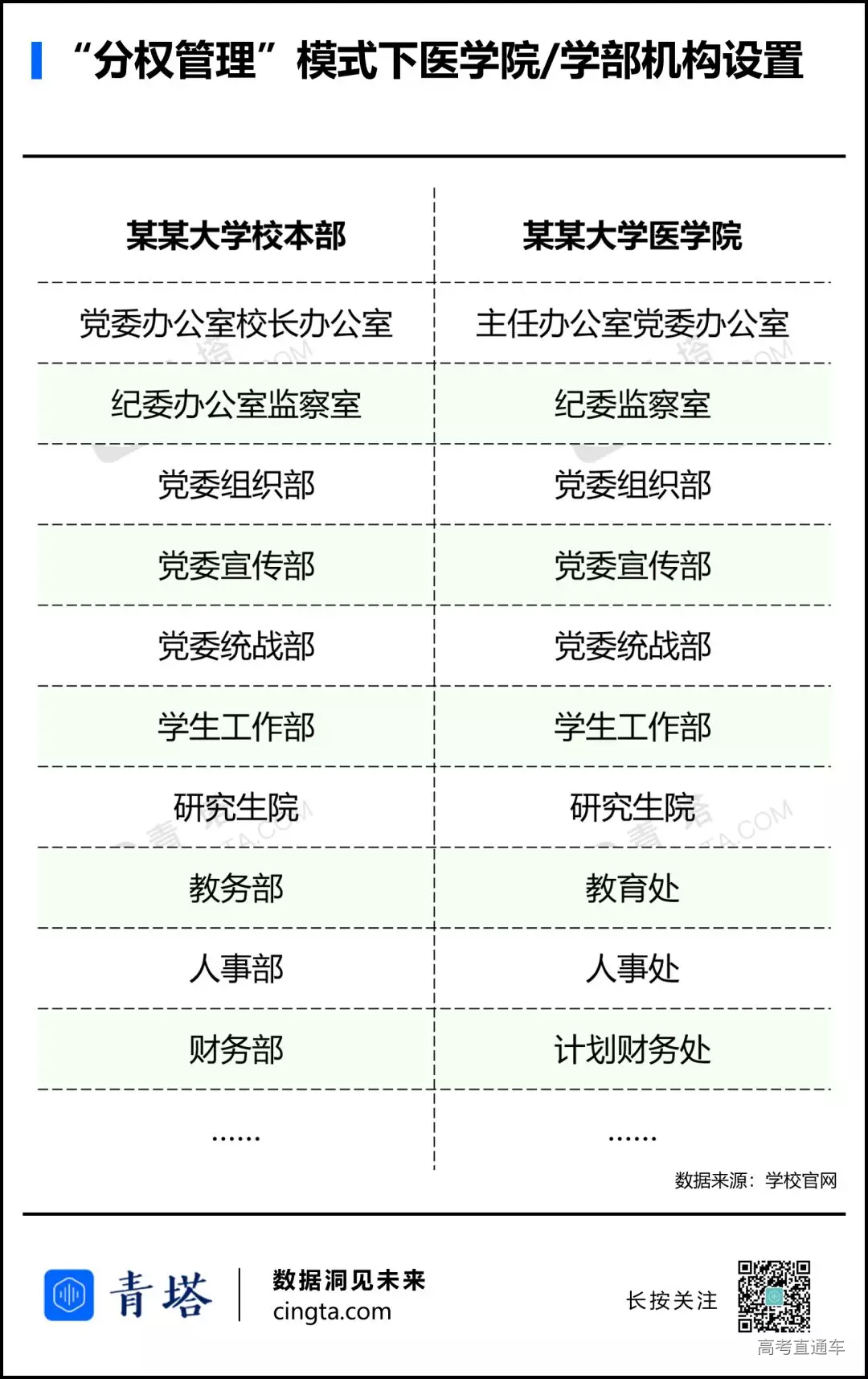 人、财、物等管理权力被统统下放到医学院(学部),校级管理机构只负责学校战略导向、发展规划、校园建设以及制定统一政策,同时负责指导、考核、协调等工作。