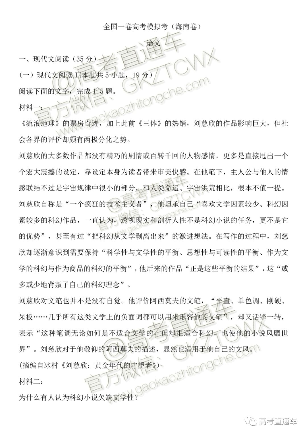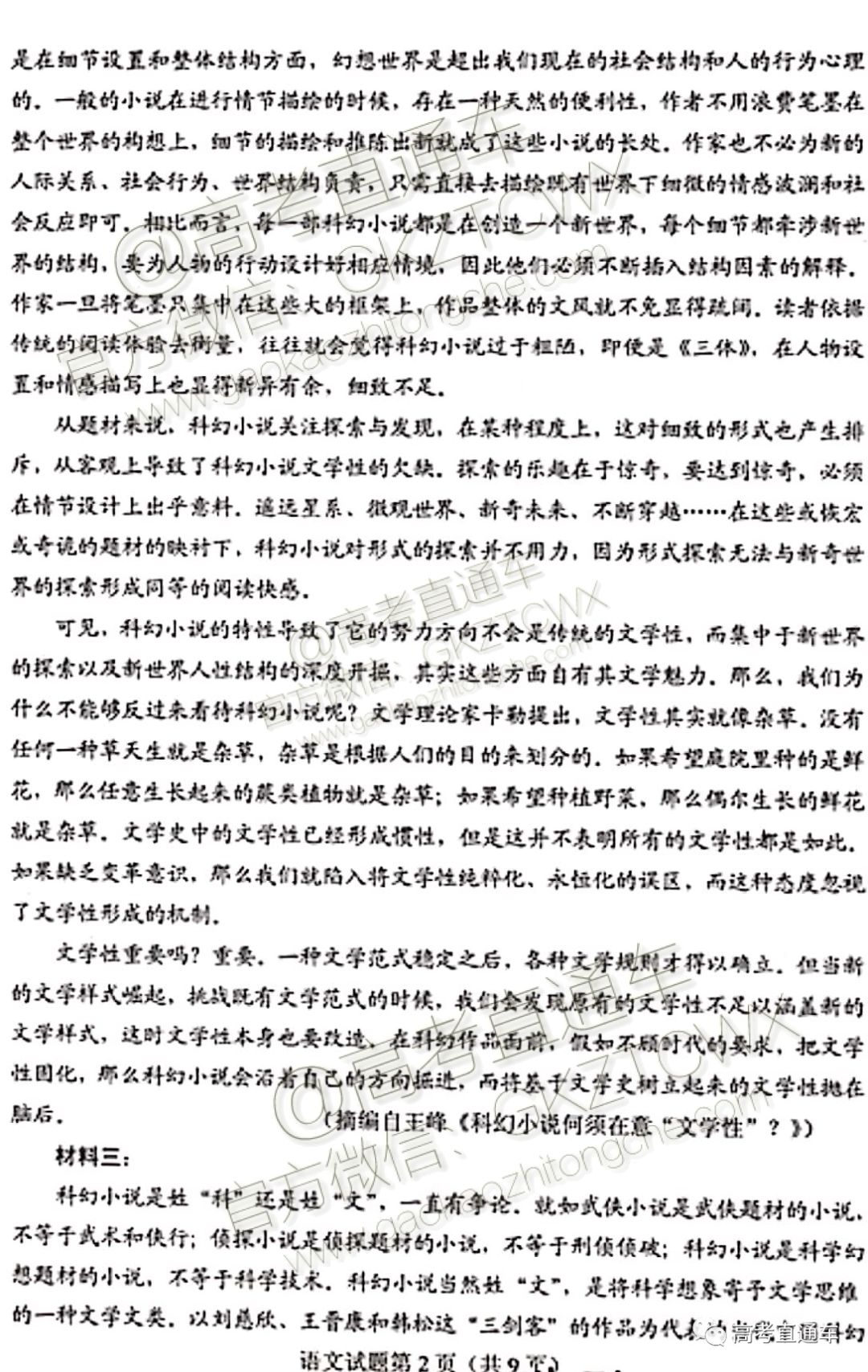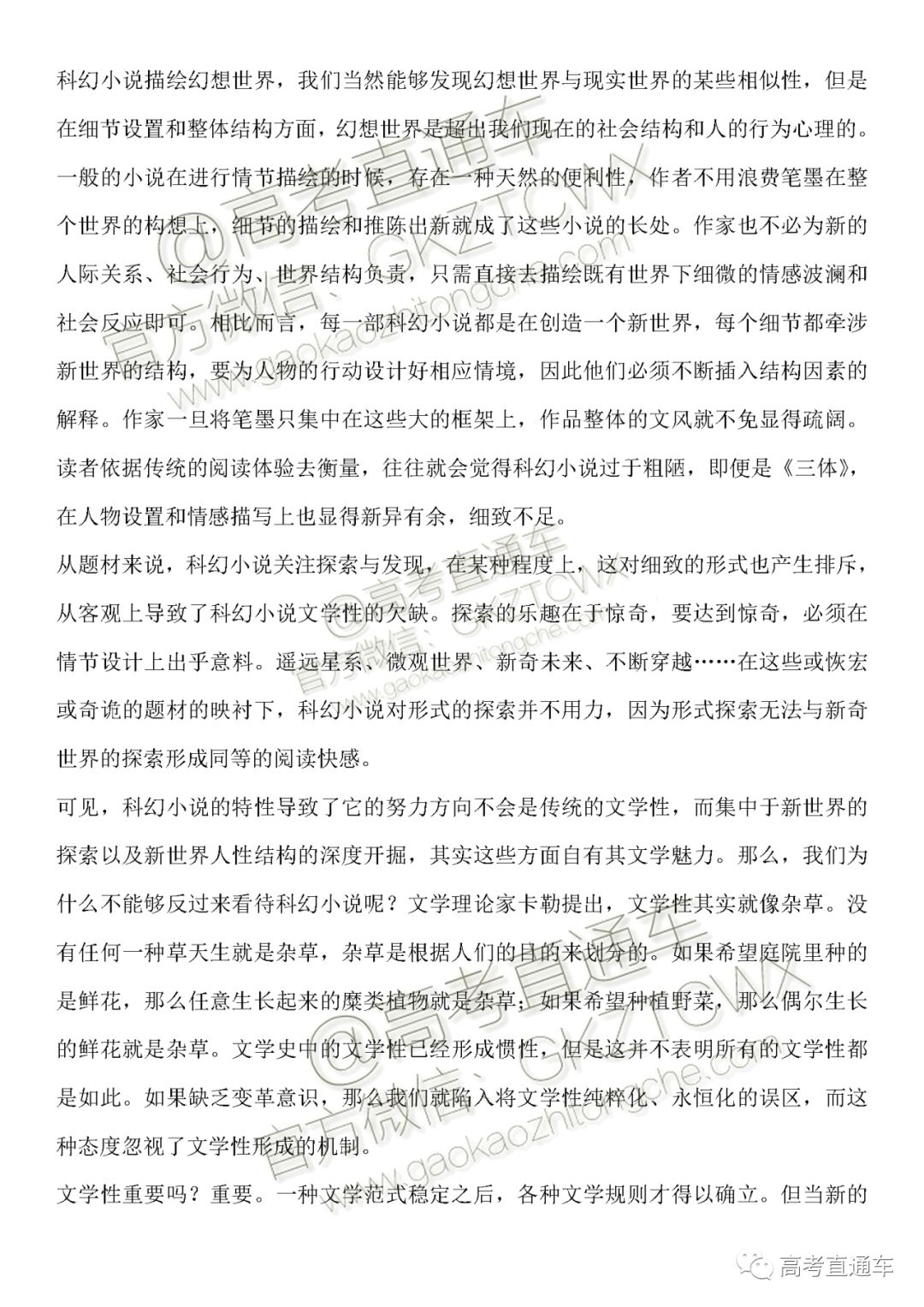 5)第5小题为问答题,题目为”用传统意义上的文学性来评价科幻小说是否合理?请结合材料谈谈你的看法“,此题与2019高考第6题相近,但试题开放性大大增强,题目难度增加。
