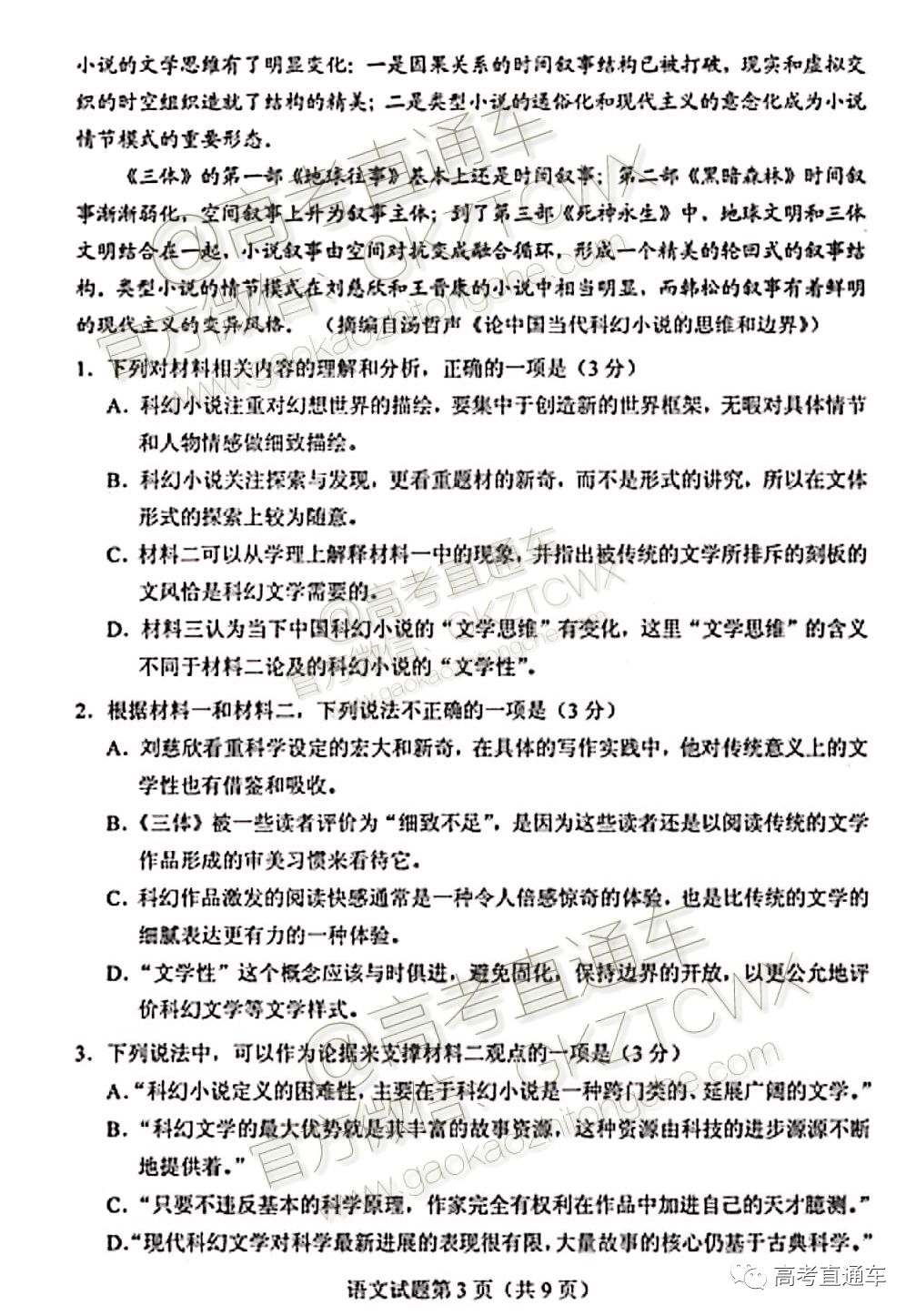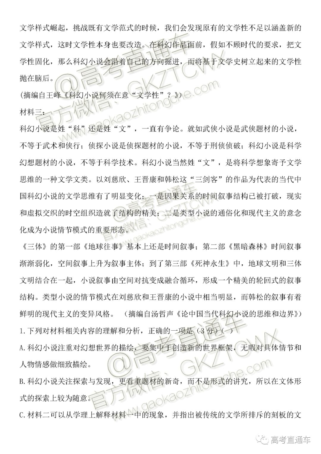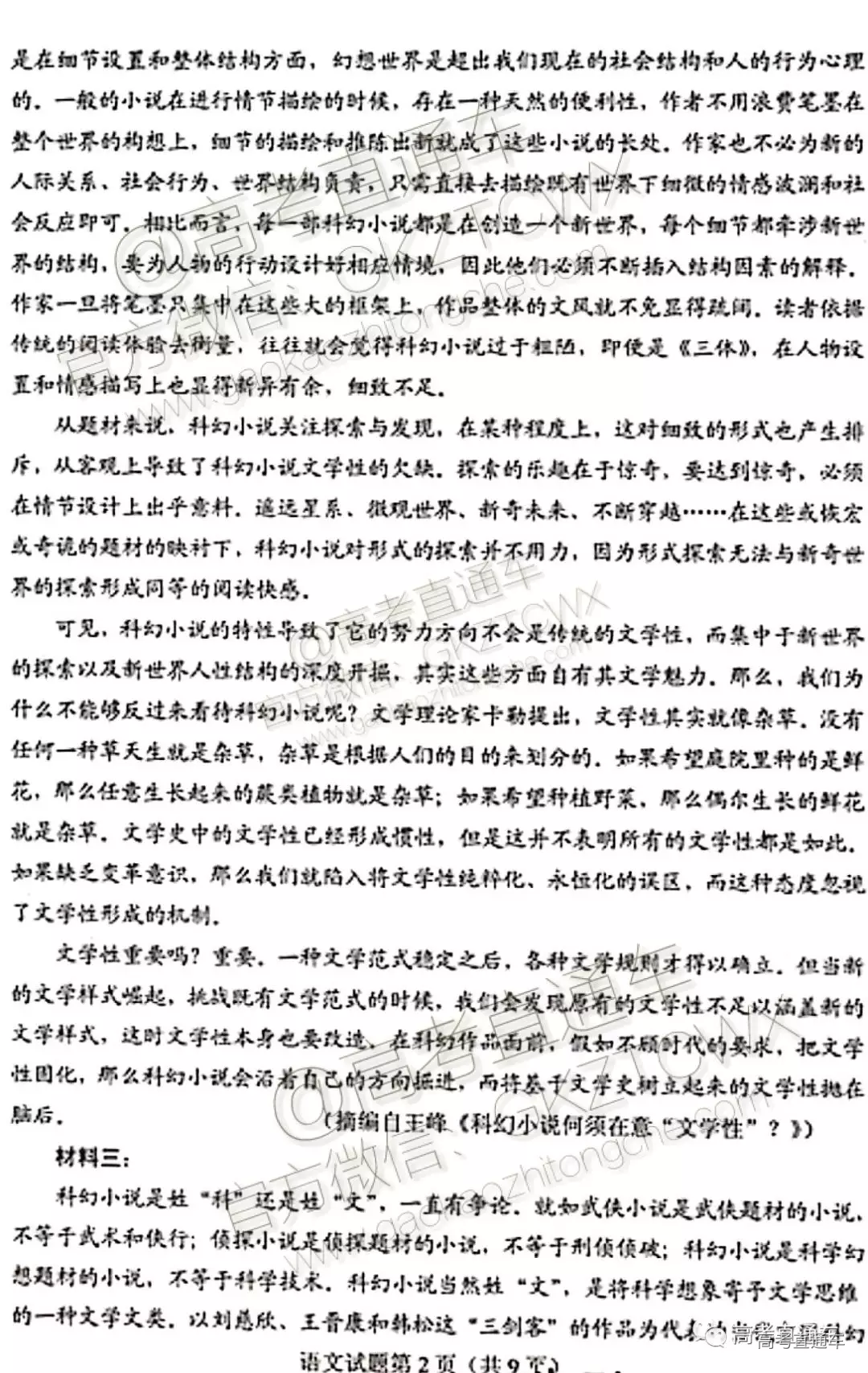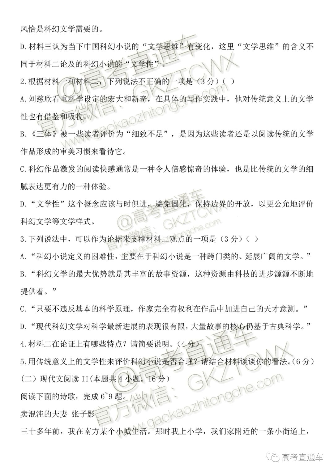 5)第5小题为问答题,题目为”用传统意义上的文学性来评价科幻小说是否合理?请结合材料谈谈你的看法“,此题与2019高考第6题相近,但试题开放性大大增强,题目难度增加。