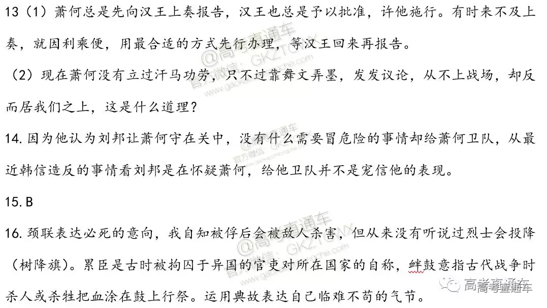 3)第14小题为新增题型(问答题),题目为”韩信死后,萧何得到皇帝封赏,众人祝贺,为什么召平却为萧何担忧?分值为3分。