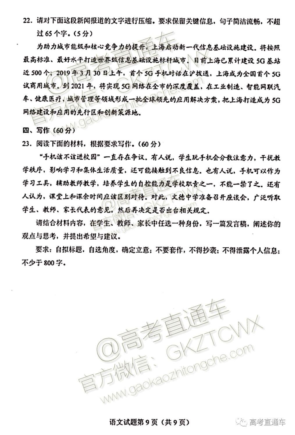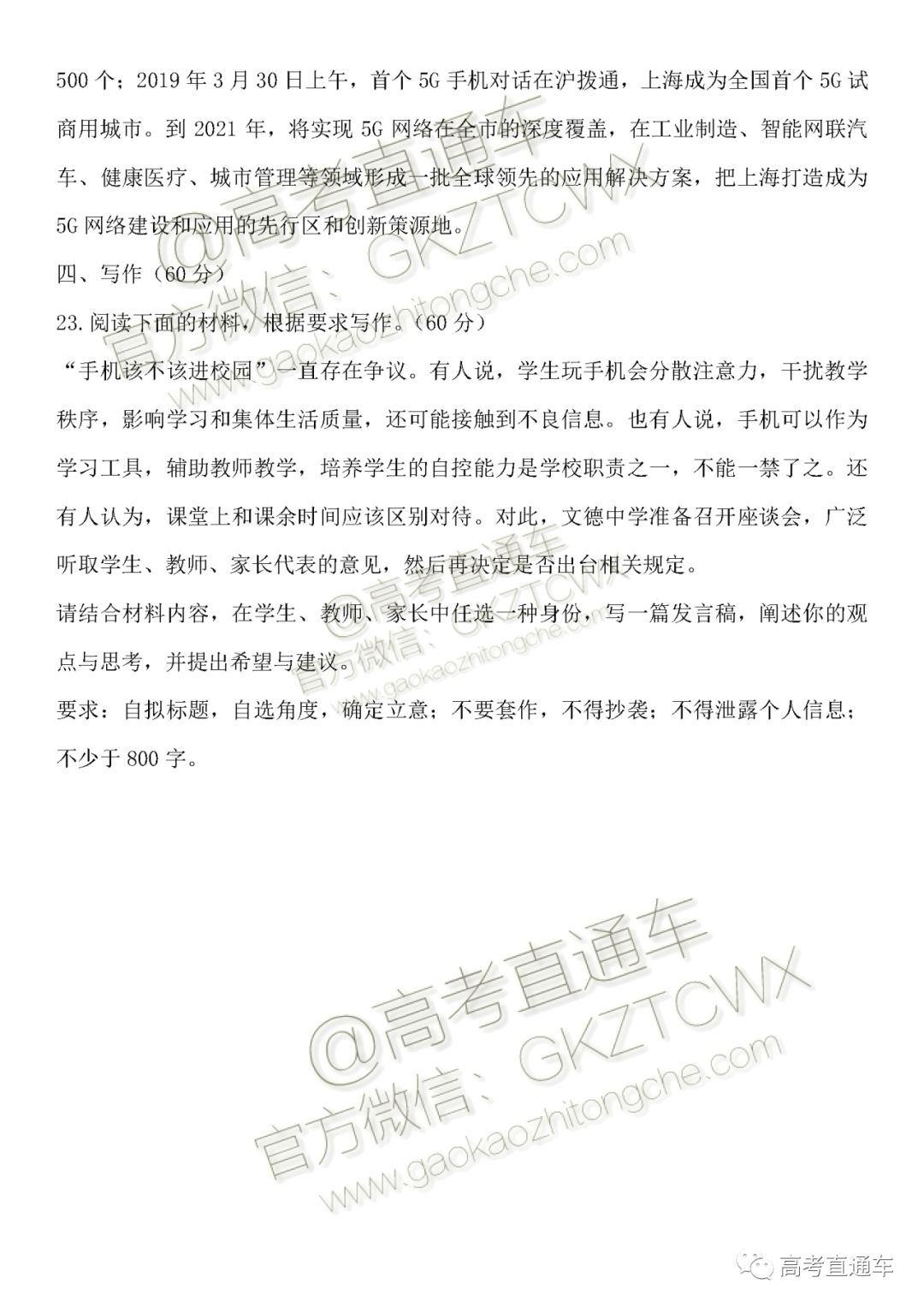 写作为写一篇发言稿,以”手机该不该进校园“为内容,以学生、教师、家长的任一身份拟写发言稿,阐述你的观点与思考,并提出希望与建议。从审题上看,没有设置多少障碍,但作文的实用色彩非常鲜明,这也是对历年来高考作文的继承,如高考中曾经让写过书信、写过演讲稿等,而且任务驱动的色彩非常鲜明,即要把自己的观点阐述清楚,并且有自己的思考(不是人云亦云),而且要有希望和建议(必须提出解决问题的具体方案),之前那种华而不实的文风可能没有什么效果了,向着为解决实际问题的方向发展。作文无变化,与2019年全国卷高考题一脉相承。