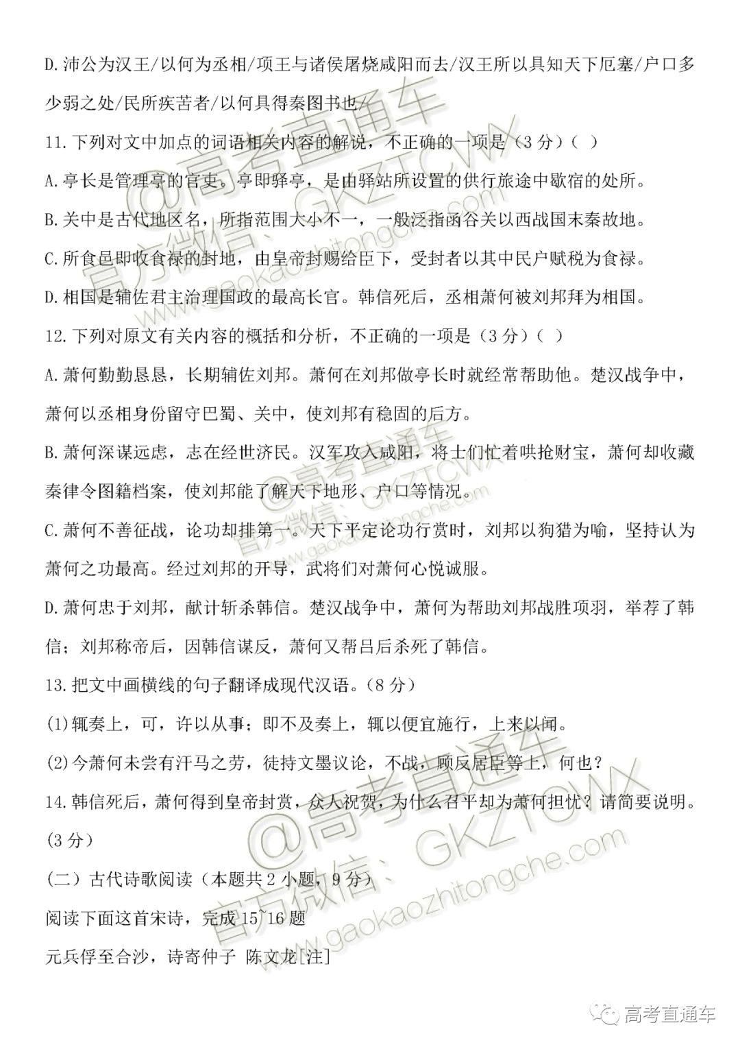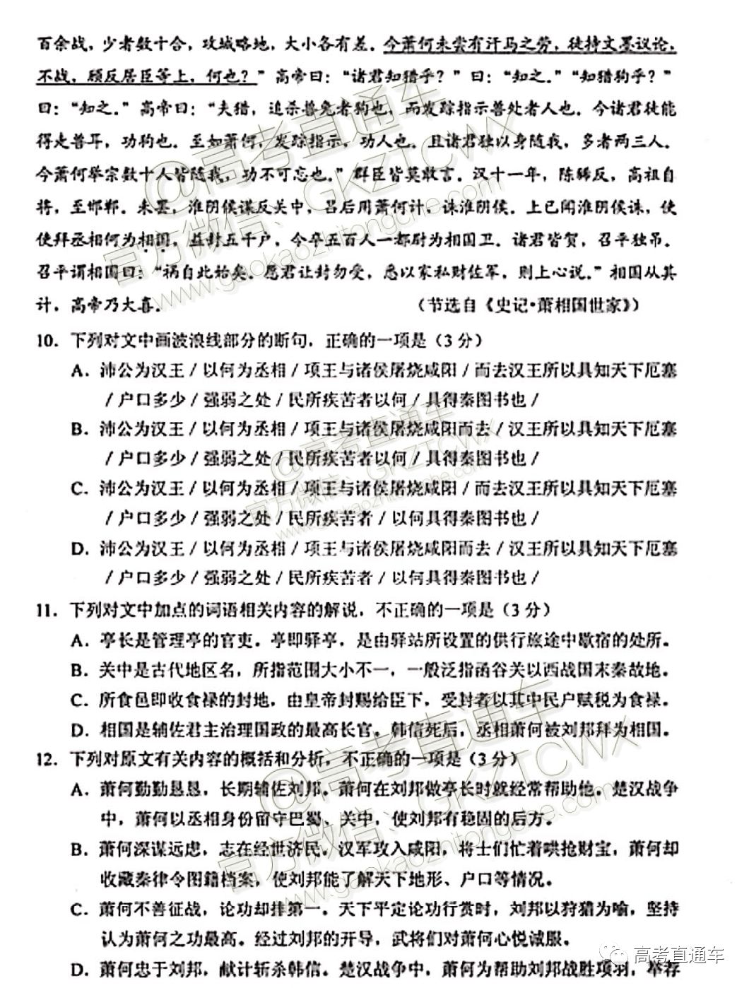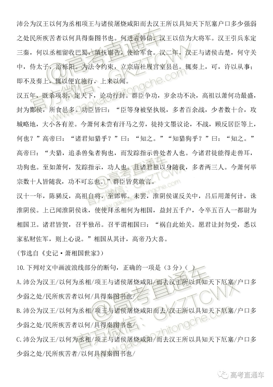 1)第10~12小题分别考查断句、文化知识、概括分析,均为每小题3分,与2019年全国卷是一致的。文言文阅读的材料为《史记·萧相国世家》的节选,与2019年全国卷文言文出处一致。