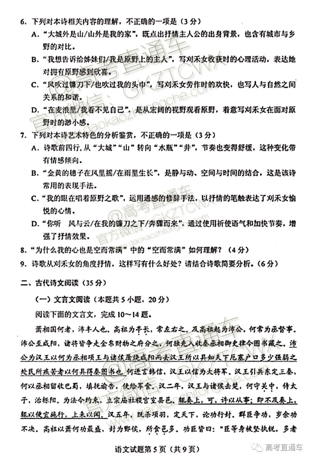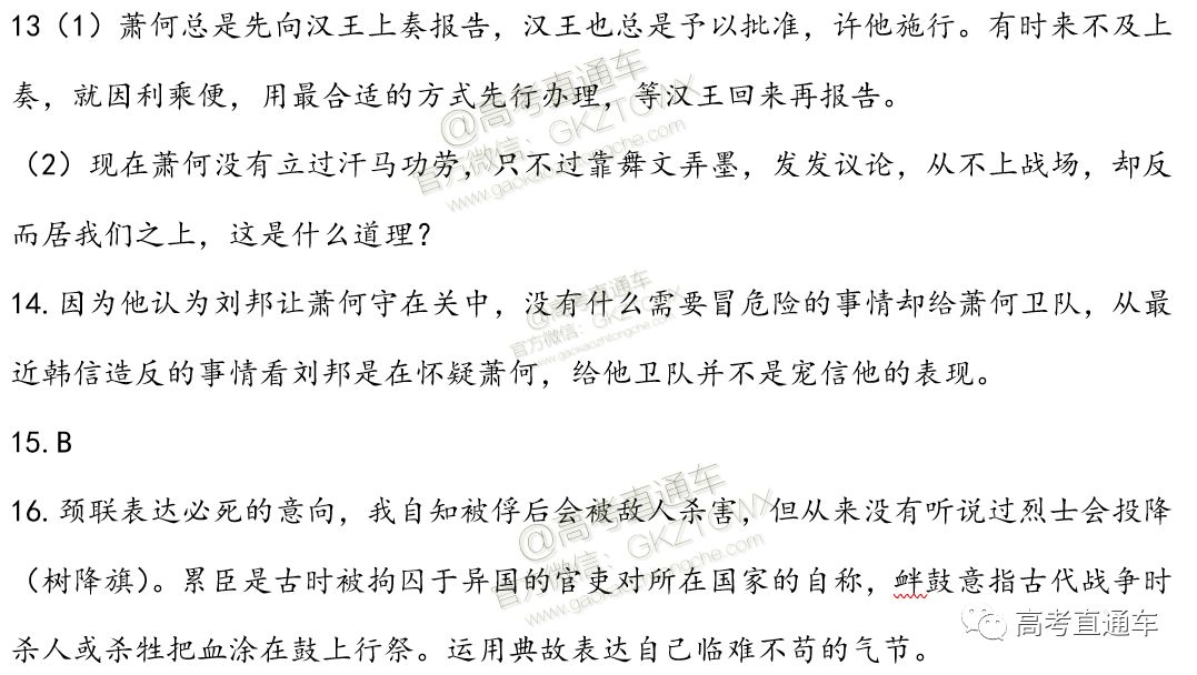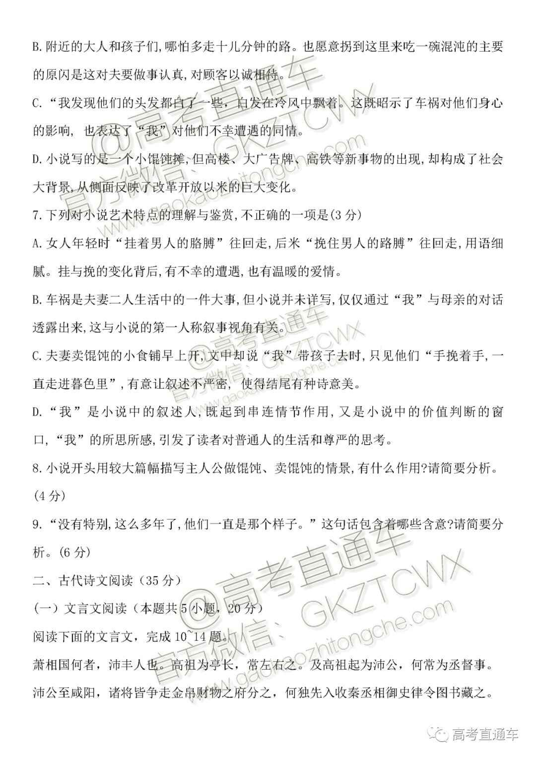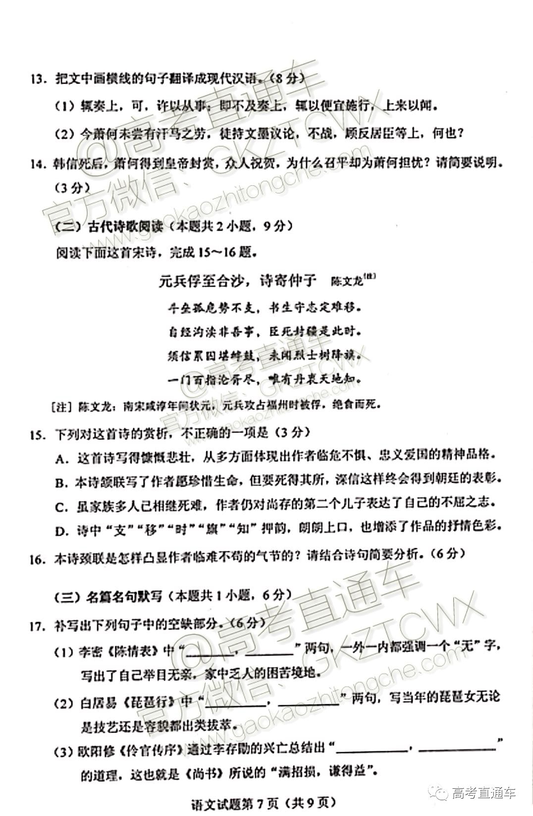 1)第10~12小题分别考查断句、文化知识、概括分析,均为每小题3分,与2019年全国卷是一致的。文言文阅读的材料为《史记·萧相国世家》的节选,与2019年全国卷文言文出处一致。
