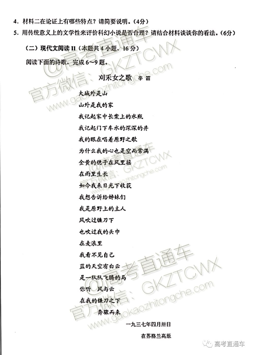 注:命题材料为辛笛的《刈禾女之歌》,估计学生和大多数老师听都没有听说过。