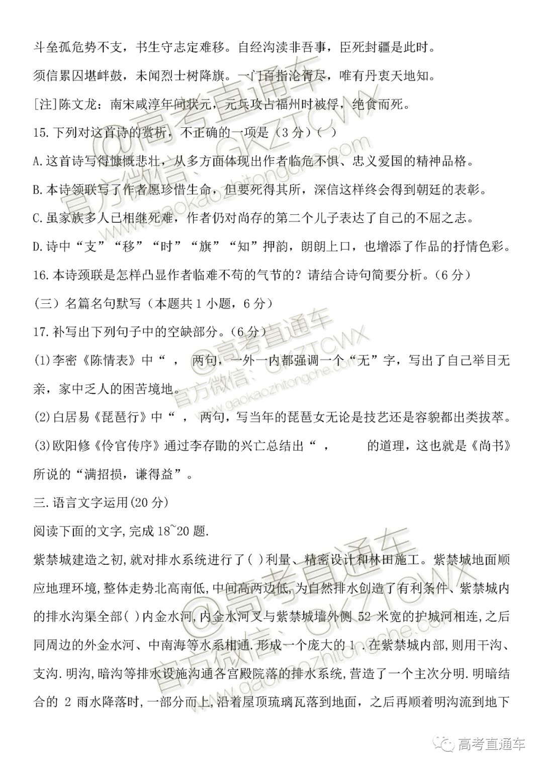 3)古诗文默写考查了李密的《陈情表》、白居易的《琵琶行》和欧阳修的《伶官传序》,与教育部下发的《新高考过渡时期语文学科背诵篇目说明》要求一致。