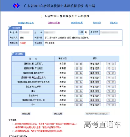 在志愿填报和注意事项中间有三个按钮,提供不同的操作,其中: