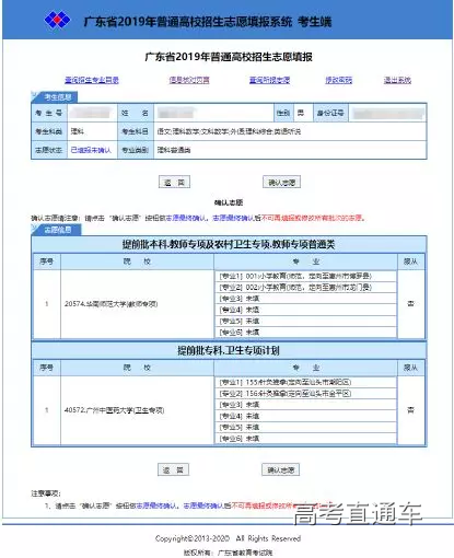 注意:在考生志愿表的上部和下部都有“返回”和“确认志愿”两个相同按钮,相同弄按钮的功能一样,其中:
