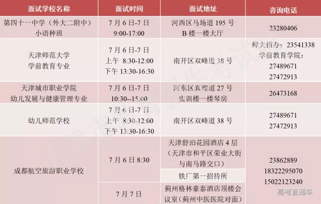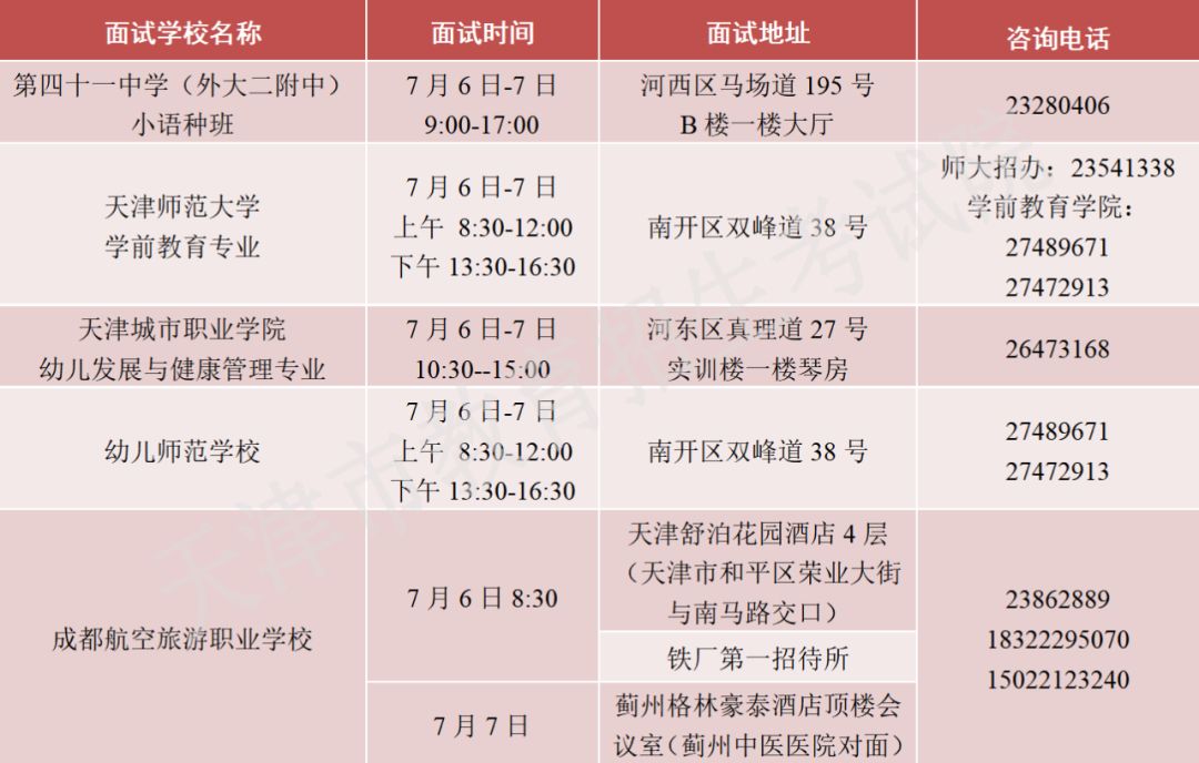 根据2019年天津市高中阶段教育学校招生计划,面试合格方可报考的高中学校有:第四十一中学(外大二附中)小语种班;面试合格方可报考的五年制高职学校有:天津师范大学学前教育专业、天津城市职业学院幼儿发展与健康管理专业;面试合格方可报考的中职学校有:幼儿师范学校、成都航空旅游职业学校。面试的具体事宜见下表: