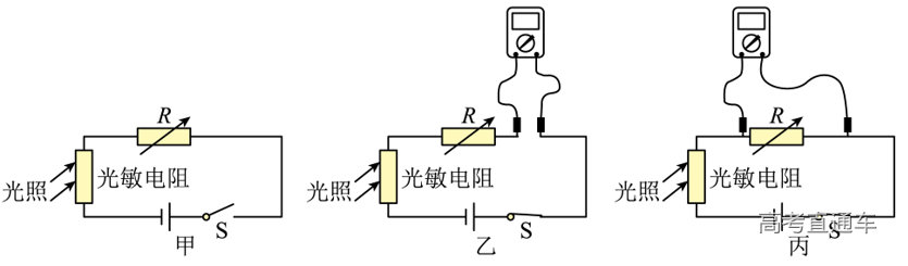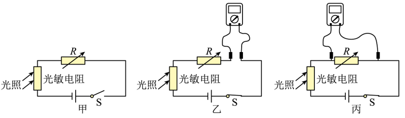 3. 某学习小组在暗室中利用多用电表验证“硫化镉光敏电阻的阻值随光照强度增大而减小”的特性,实验电路如图甲所示。保持电阻箱R的阻值不变,则( )