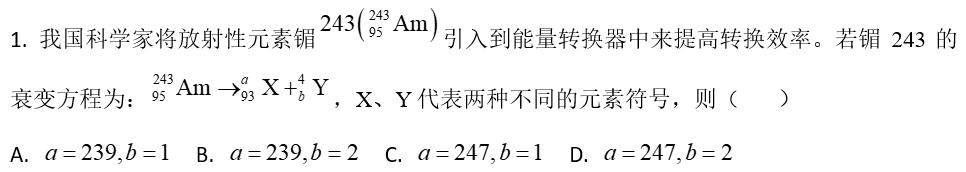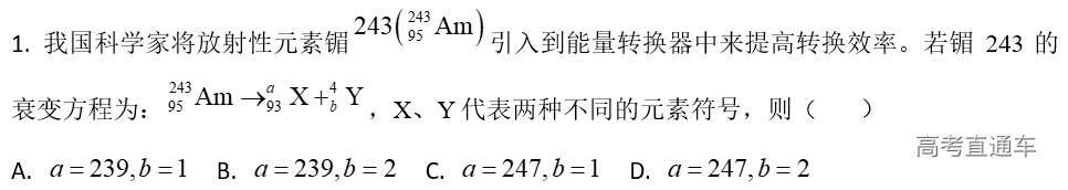【解析】由质量数和核电荷数守恒可知243=a+4、95=93+b,解得a=239, b=2. 故选B。