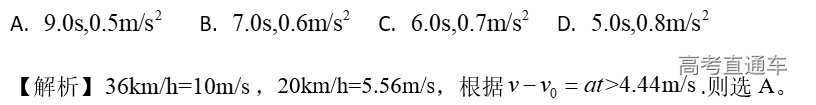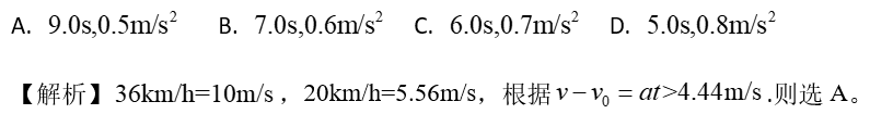 5. 司机驾驶汽车以的速度在平直道路上匀速行驶。当司机看到标有“学校区域限速20km/h”的警示牌时,立即开始制动,使汽车做匀减速直线运动,直至减到小于20km/h的某速度。则该匀减速阶段汽车的行驶时间和加速度大小可能是( )