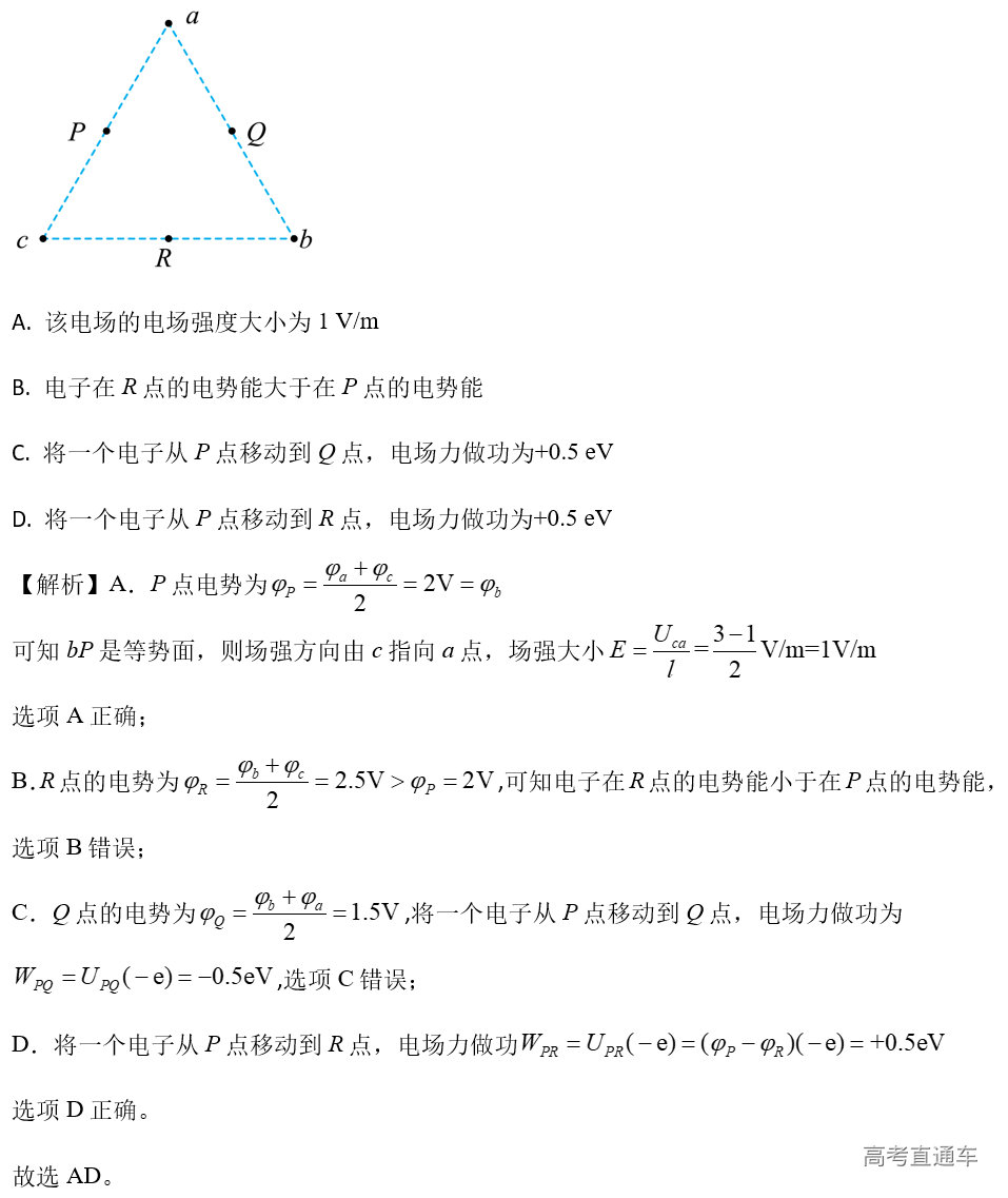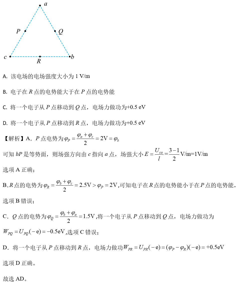 9. 空间中有方向与纸面平行的匀强电场,其中纸面内P、Q和R三点分别是等边三角形abc三边的中点,如图所示。已知三角形的边长为2 m,a、b和c三点的电势分别为1 V、2 V和3 V。下列说法正确的是( )