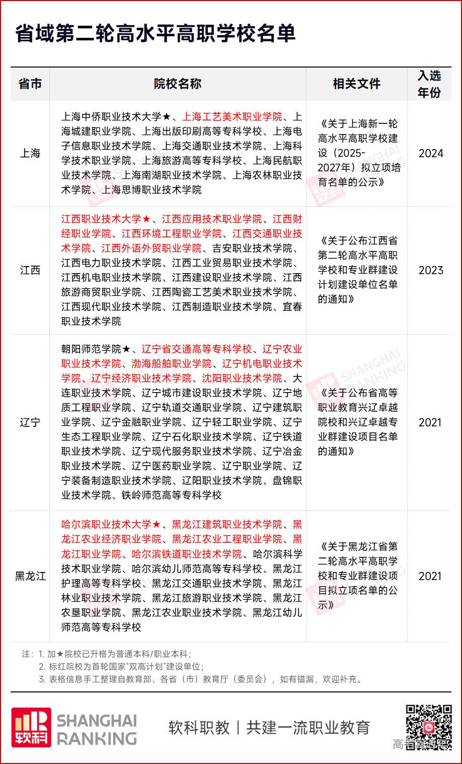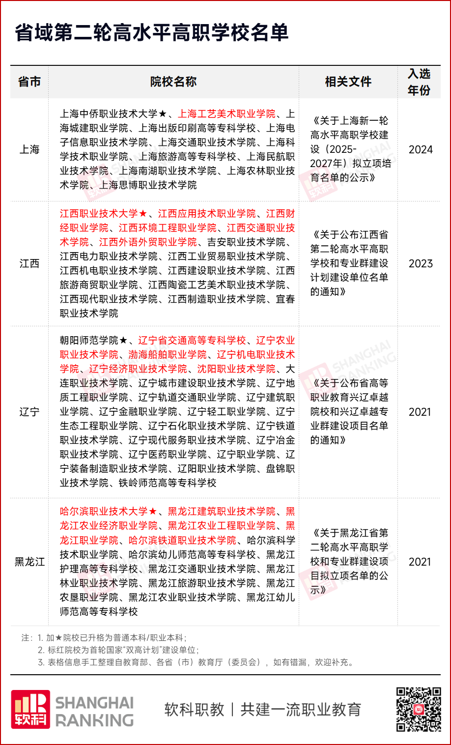 据不完全统计,截至2024年年末,黑龙江、辽宁、江西、上海已陆续启动新一轮省域“双高计划”,并公布(示)了立项名单。【软科职教】将其中的“高水平高职学校”立项单位整理汇总,名单如下。