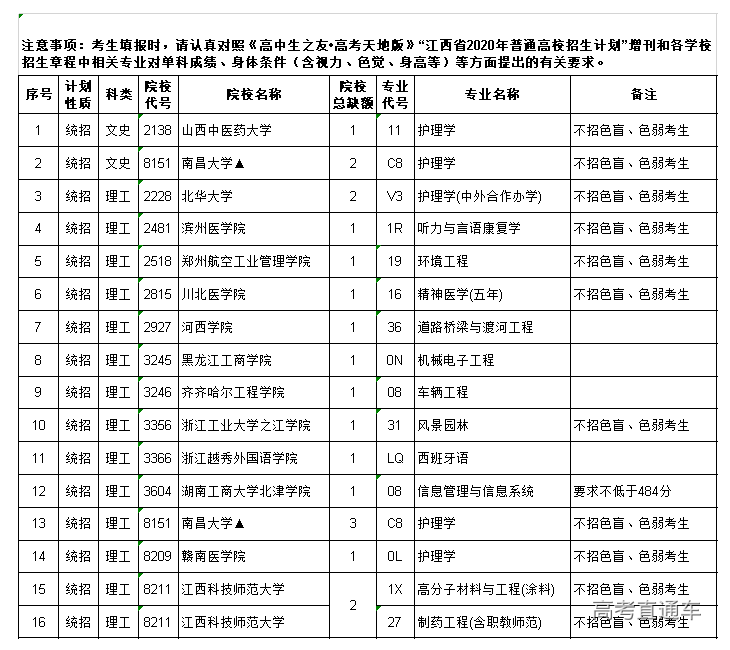 7.考生填报时,请认真对照《高中生之友•高考天地版》“江西省2020年普通高校招生计划”增刊和各高校招生章程中相关专业对单科成绩、身体条件(含视力、色觉、身高等)等方面提出的有关要求。