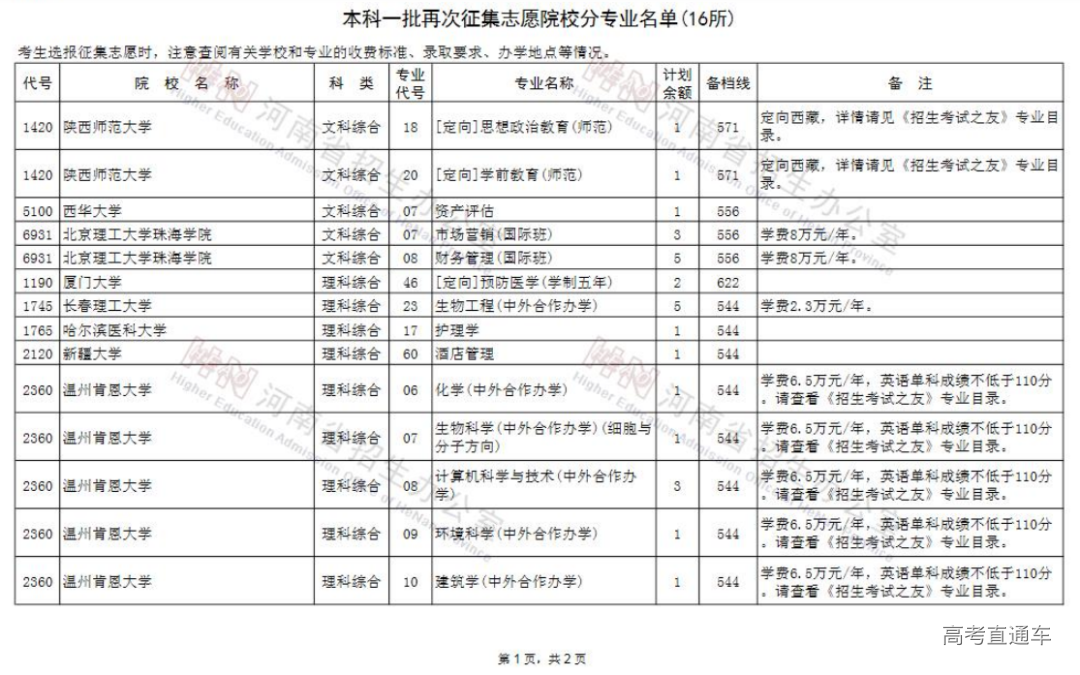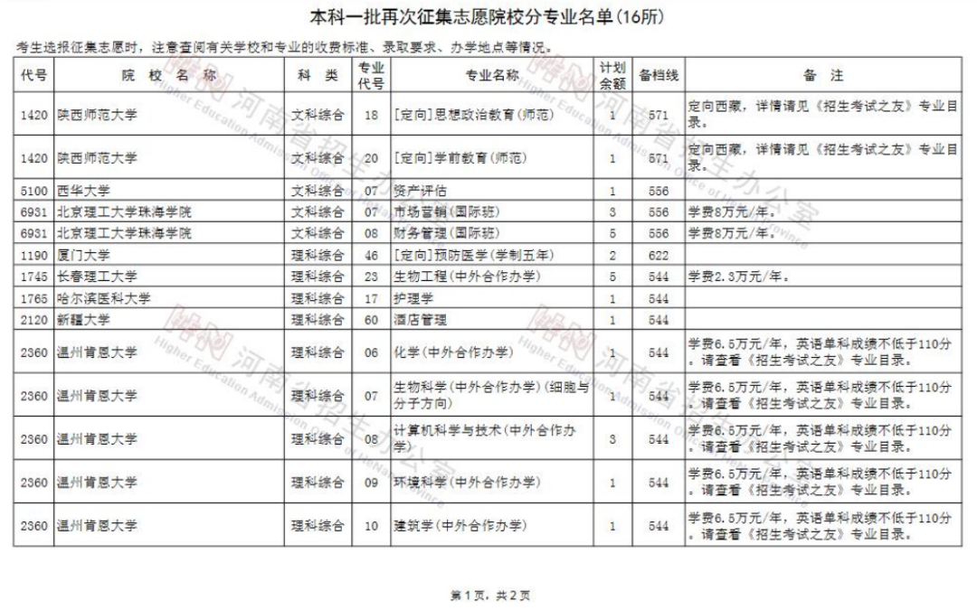 (一)本科一批再次征集志愿院校分专业名单(16所)