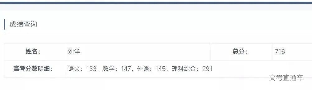 语文:133,数学:147,外语:145,理综:291,总分:716。