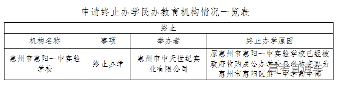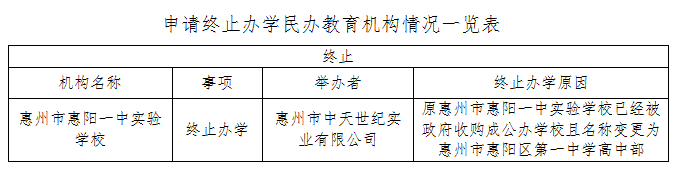 关于惠州市惠阳一中实验学校 终止办学的公示