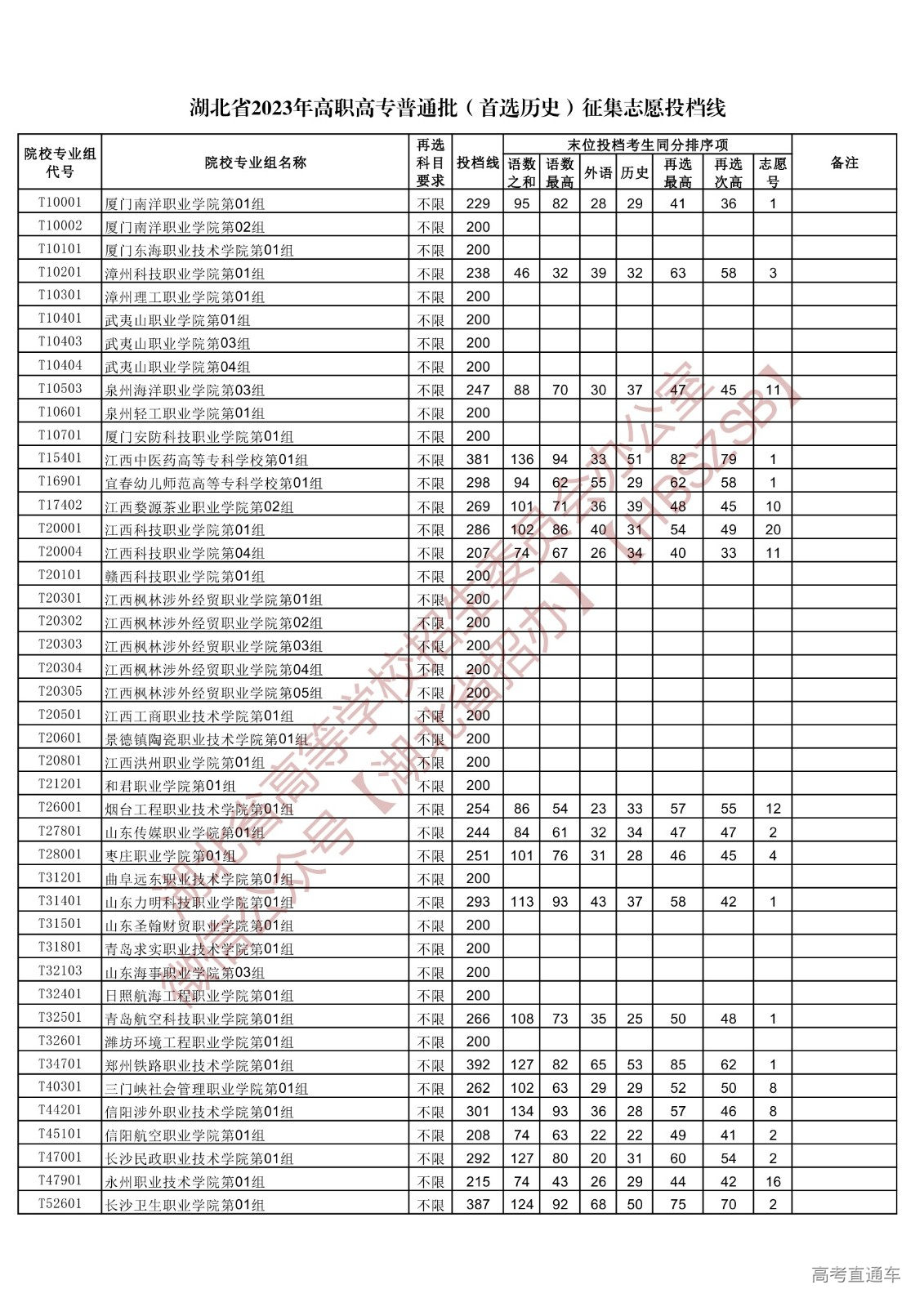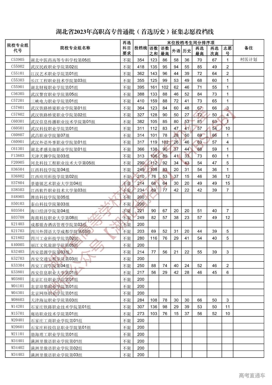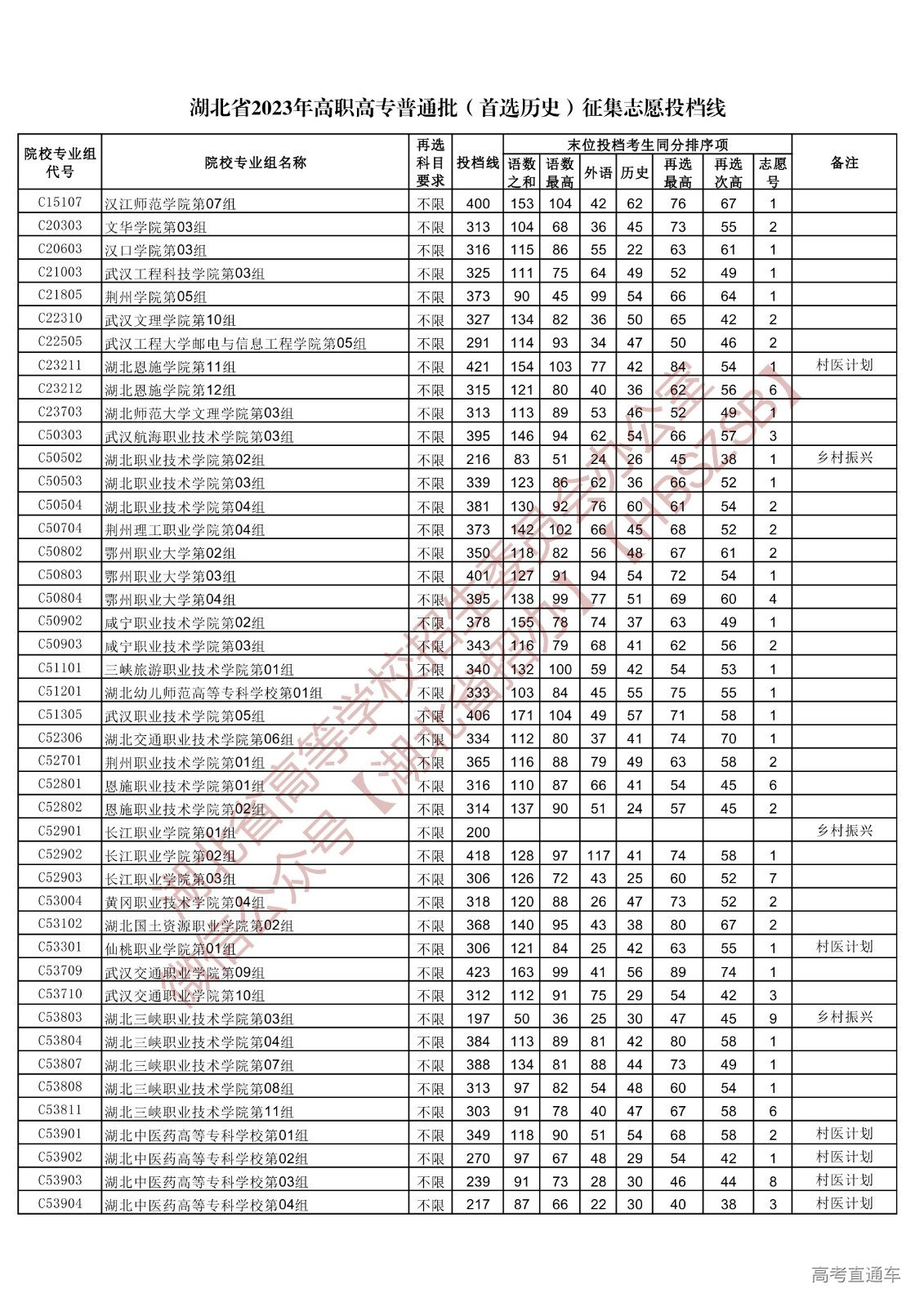 湖北2023年高职高专普通批(首选历史)征集志愿投档线