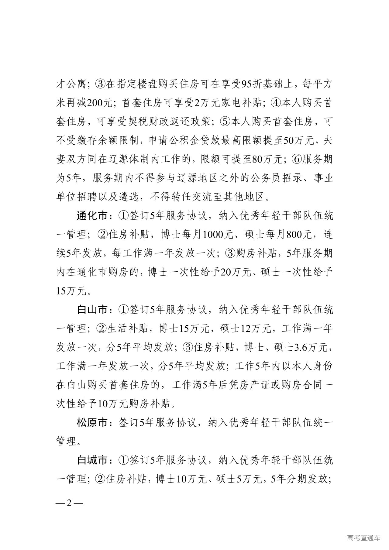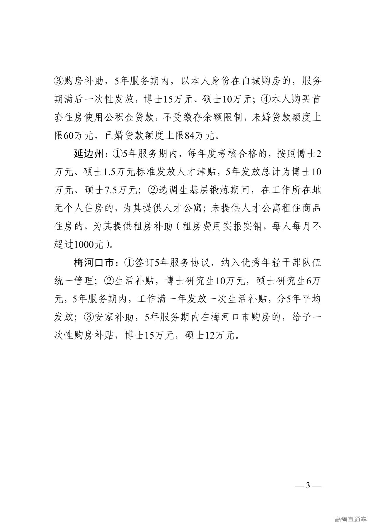 5.录用到省直部门(含垂直管理部门、市州法检系统、长白山管委会)的选调生,提供安家补助并偿还助学贷款,安家补助标准为博士20万元、硕士15万元,分5年发放;录用到各市州部门(不含长春市)的选调生,在省级选调政策基础上,同时享受本地有关政策;录用到长春市的选调生单独享受长春市有关政策(详见附件2)。