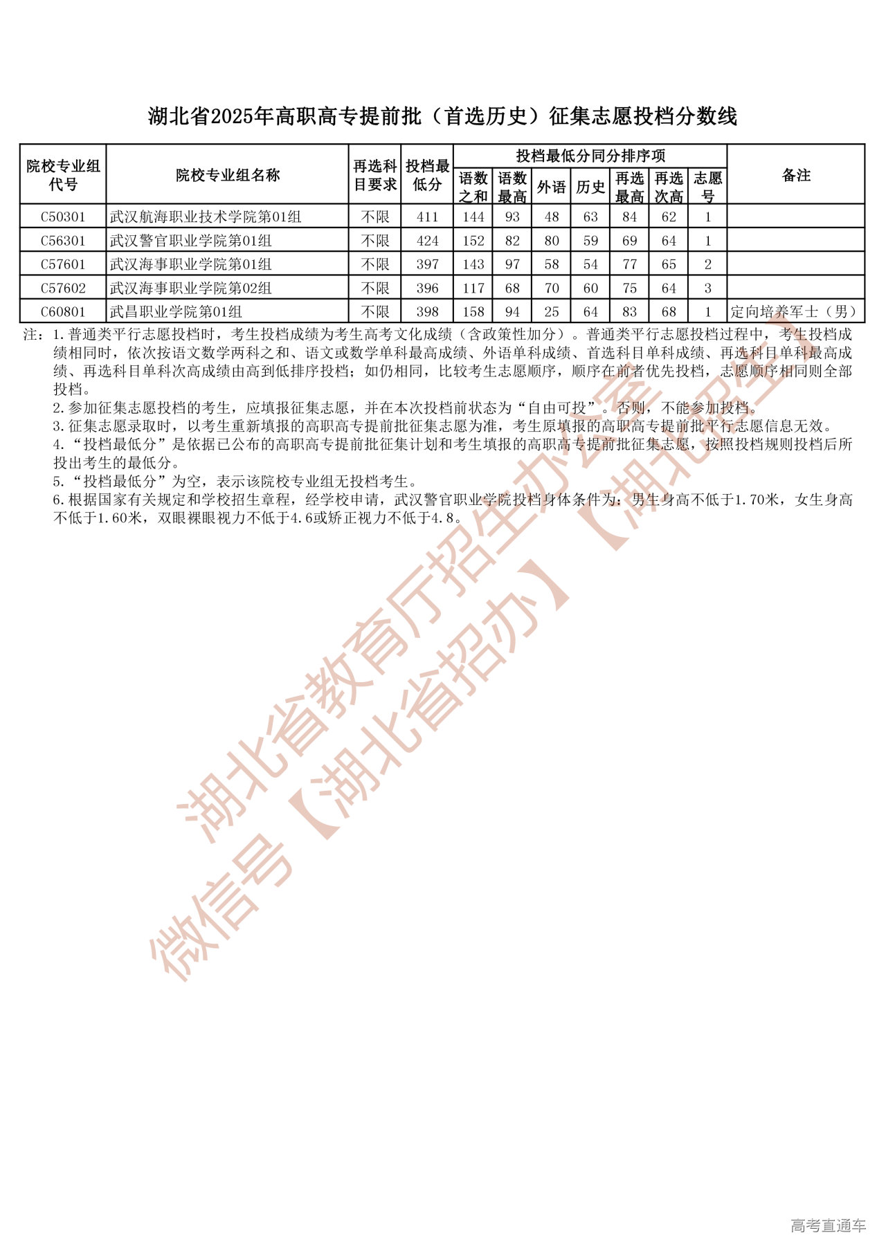 湖北省2025年高职高专提前批(首选历史)征集志愿投档分数线.pdf
