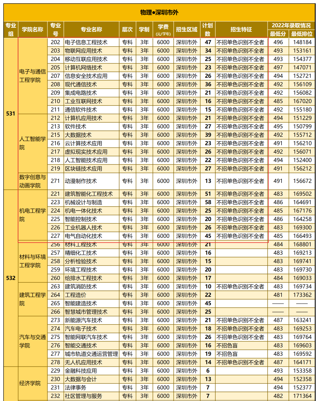 1.屈光不正(近视眼或远视眼,下同)任何一眼矫正到4.8,镜片度数大于400度。 海洋技术、海洋科学、测控技术与仪器、核工程与核技术、生物医学工程、服装设计与工程、飞行器制造工程。专科专业:与以上相同或相近专业 2.任何一眼矫正到4.8,镜片度数大于800度。 地矿类、水利类、土建类、动物生产类、水产类、材料类、能源动力类、化工与制药类、武器类、农业工程类、林业工程类、植物生产类、森林资源类、环境生态类、医学类、心理学类、环境与安全类、环境科学类、电子信息科学类、材料科学类、地质学类、大气科学类及地理科学、测绘工程、交通工程、交通运输、油气储运工程、船舶与海洋工程、生物工程、草业科学、动物医学各专业。专科专业:与以上相同或相近专业。 3.一眼失明另一眼矫正到4.8,镜片度数大于400度。 工学、农学、医学、法学各专业及应用物理学、应用化学、生物技术、地质学、生态学、环境科学、海洋科学、海洋技术、生物科学、应用心理学等专业。 4.斜视。 医学类专业 1.轻度色觉异常(俗称色弱)。 以颜色波长作为严格技术标准的化学类、化工与制药类、药学类、生物科学类、公安技术类、地质学类各专业,医学类各专业;生物工程、生物医学工程、动物医学、动物科学、野生动物与自然保护区管理、心理学、应用心理学、生态学、侦察学、特种能源工程与烟火技术、考古学、海洋科学、海洋技术、轮机工程、食品科学与工程、轻化工程、林产化学、农学、园艺、植物保护、茶学、林学、园林、蚕学、农业资源与环境、水产养殖学、海洋渔业科学与技术、材料化学、环境工程、高分子材料与工程、过程装备与控制工程、学前教育、特殊教育、体育教育、运动训练、运动人体科学、民族传统体育各专业。 2.色觉异常Ⅱ度(俗称色盲)。 除同轻度色觉异常外,还包括美术学、绘画、艺术设计、摄影、动画、博物馆学、应用物理学、天文学、地理科学、应用气象学、材料物理、矿物加工工程、资源勘探工程、冶金工程、无机非金属材料工程、交通运输、油气储运工程等专业。专科专业与以上专业相同或相近专业。 3.不能准确识别红、黄、绿、蓝、紫各种颜色中任何一种颜色的导线、按键、信号灯、几何图形者。 除同轻度色觉异常、色觉异常Ⅱ度两类列出专业外,还包括经济学类、管理科学与工程类、工商管理类、公共管理类、农业经济管理类、图书档案学类各专业。不能准确在显示器上识别红、黄、绿、兰、紫各颜色中任何一种颜色的数码、字母者不能录取到计算机科学与技术等专业。 4.裸眼视力任何一眼低于5.0者。 飞行技术、航海技术、消防工程、刑事科学技术、侦察。专科专业:海洋船舶驾驶及与以上专业相同相近专业(如民航空中交通管制)。 5.裸眼视力任何一眼低于4.8者。 轮机工程、运动训练、民族传统体育。专科专业:烹饪与营养、烹饪工艺等。 根据《军队院校招收学员体格检查标准》第五章 眼科项目 第三十九条 裸眼视力低于4.5,不合格。 任何一眼裸眼视力低于4.9,需进行矫正视力检查,任何一眼矫正视力低于4.9或矫正度数超过600度,不合格。 屈光不正经准分子激光手术后半年以上且无并发症,任何一眼裸眼视力达到4.9,眼底检查正常,除指挥、装甲、测绘、雷达、水面舰艇、潜艇、潜水、空降、特种作战专业外合格。 其中: (1)指挥、装甲、测绘、雷达、水面舰艇、潜艇专业,任何一眼裸眼视不低于4.9; (2)潜水、空降、特种作战专业,任何一眼裸眼视力不低于5.0。 第四十条 色弱、色盲,不合格。 能够识别红、绿、黄、蓝、紫各单色者,除指挥、水面舰艇、潜艇、空降、装甲、测绘、雷达专业外合格。 第四十一条 影响眼功能的眼睑、睑缘、结膜、泪器疾病,不合格。 第四十二条 眼球突出,眼球震颤,眼肌疾病,运动障碍,显性斜视,不合格。 15度以内的共同性内、外斜视,除指挥、装甲、测绘、水面舰艇、潜艇、潜水、空降、雷达专业外合格。 第四十三条 角膜、巩膜、虹膜睫状体疾病,瞳孔变形、运动障碍,不合格。 但是不影响视功能的角膜云翳,角膜缘外非进行性翼状胬肉,除指挥专业外合格。 第四十四条 晶状体、玻璃体、脉络膜、视网膜、视神经疾病,青光眼,不合格。 下列情况合格: (1)先天性少数散在的晶状体小混浊点,不影响视功能的; (2)短小的玻璃体动脉残遗,少数丝、点状玻璃体混浊,无症状的。 报考公安类院校的考生,除按普通高等院校招生体检工作指导意见执行外,还应具备下列条件: 左右眼单眼裸视力,理科类专业应在4.9(0.8)以上,文科类专业应在 4.8(0.6)以上。无色盲、色弱。 看到这里,相信大家对于哪些对视力要要求的大学专业已经有了底。 对于2024届高考生来说,高考体检结果极为重要,如果体检结果不合格,对于自己想要报考的专业可能会产生一定的影响,不仅是报军校的考生,普通类专业的考生也存在因体检结果不符合报考专业限制,而被退档的可能。 例如2023年深圳职业技术大学在学考招生中,部分专业不招单色识别不全者👇 每年都有学生因为高考体检结果不符合专业条件,而被院校退档。为了避免这种情况的发生,建议大家提前了解不同学校专业组的录取要求。 一般情况下,在体检进行阶段,体检表示身体有异常的,医生或相关工作人员都会告知考生,