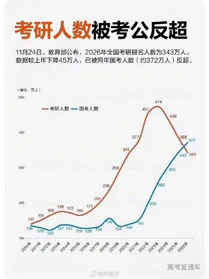 据教育部网站11月24日消息,2026年全国硕士研究生招生考试将于2025年12月20日至21日举行,据统计,考试报名人数为343万。另据国家公务员局数据,2026国考共有371.8万人通过用人单位资格审查。回溯历史数据可以发现,2026年考研人数已连续第三年下降,同年考公人数已超越考研。