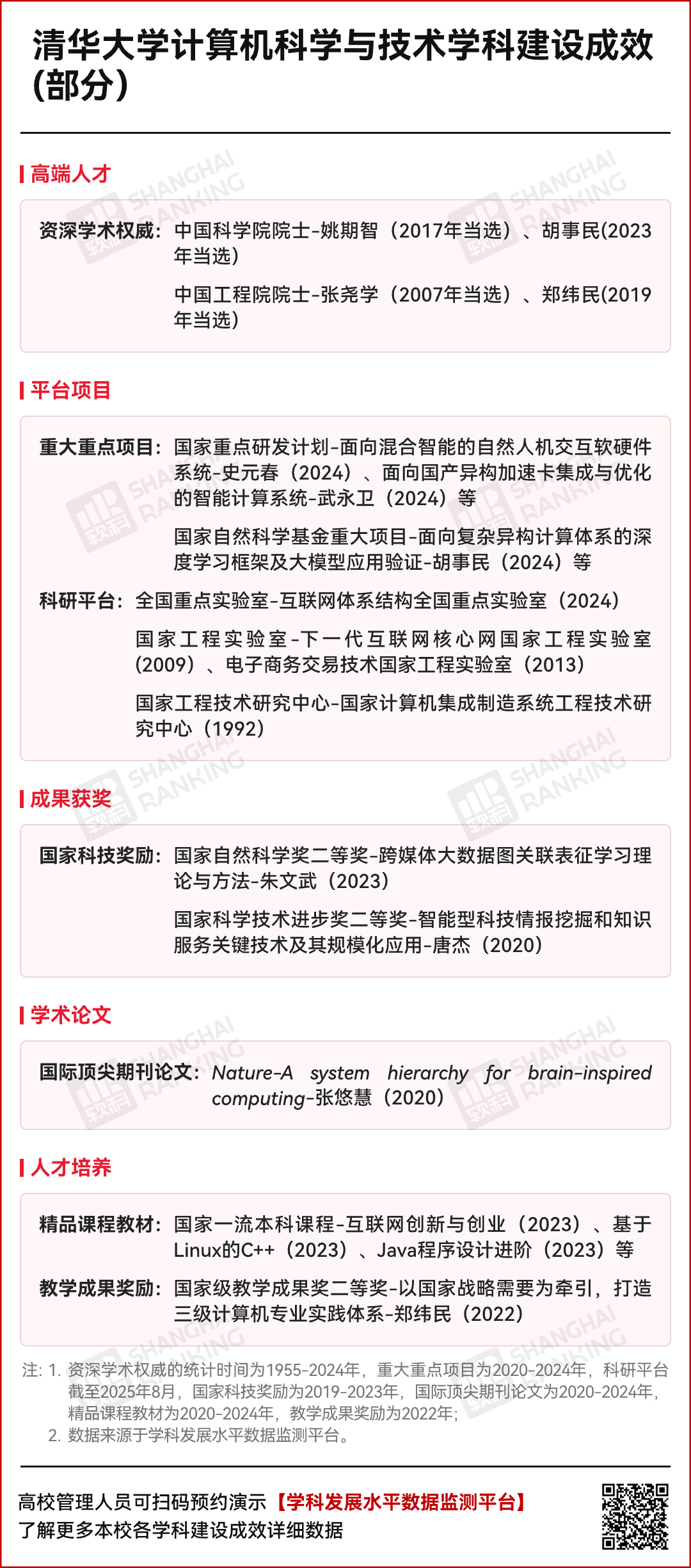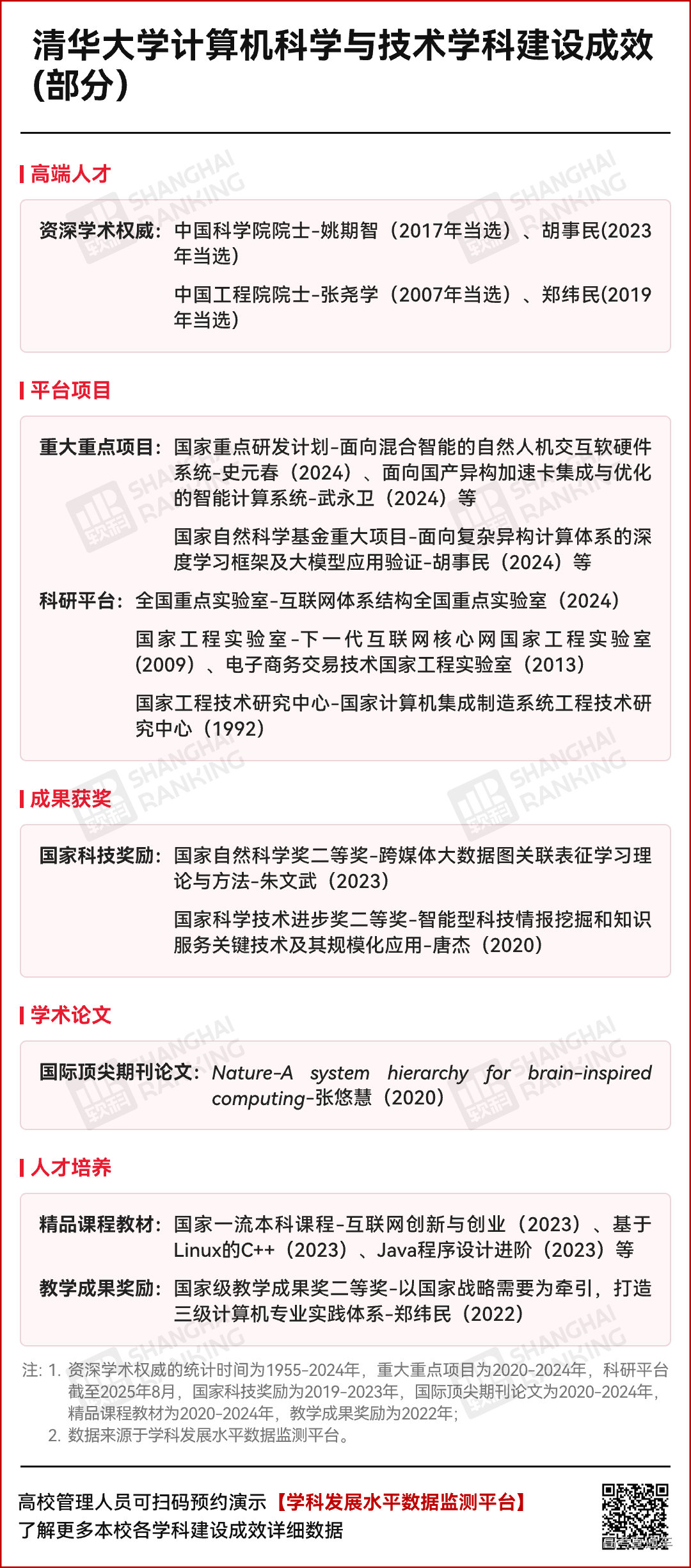 清华大学计算机科学与技术学科是1981年中国高校首批博士点之一,并有首批博士生导师1人。自2017软科中国最好学科排名发布以来,清华大学已连续9年蝉联第1。建设至今,学校的计算机科学与技术学科取得诸多成效。
