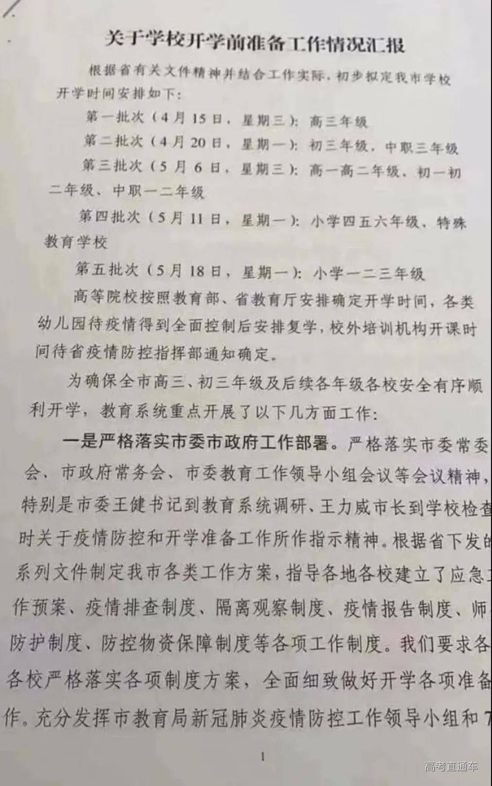 4月中旬,高中三年级、初中三年级同日分批错时错峰返校,具体时间待省教育厅通知后确定。