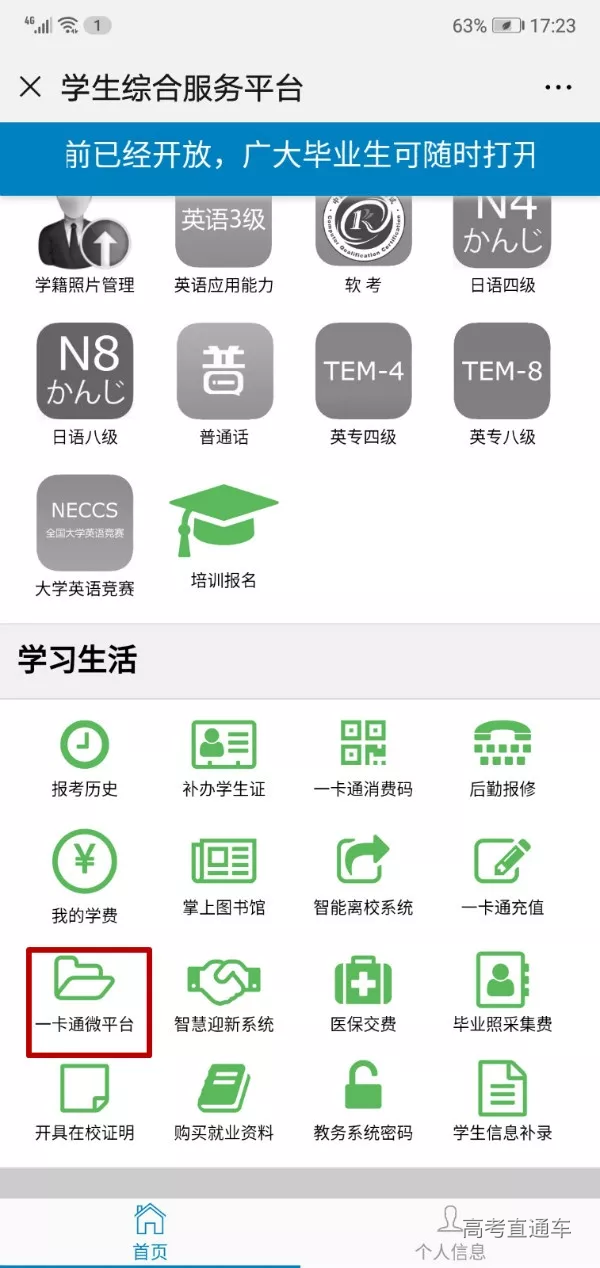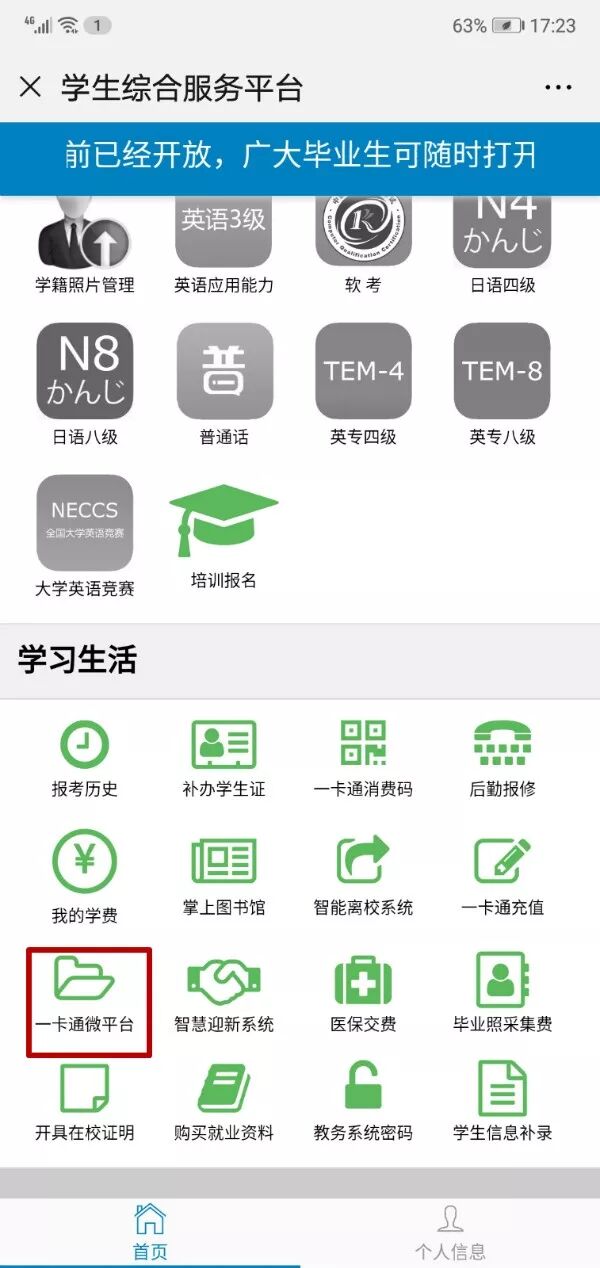 进入学校官方微信公众号即可使用一卡通管理平台,可使用微信充值与扫码服务、银行充值服务、个人校内信息服务,掌上校园服务,可实现查询消费记录、转账、挂失等功能。