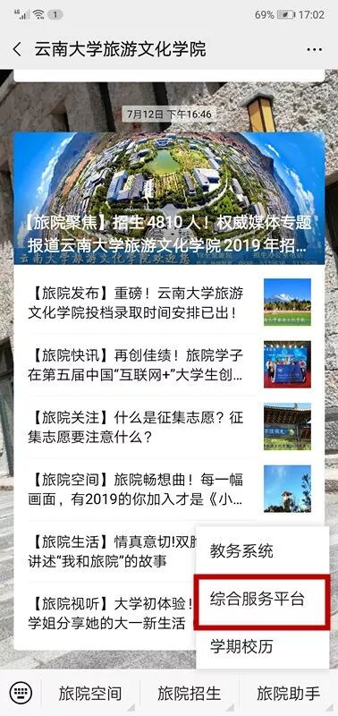 手机等移动终端访问方式:关注“云南大学旅游文化学院”官方公众号(二维码见本手册封底),进入公众号后点击“旅院助手”—单击“综合服务平台”进入平台找到“智慧迎新系统”后点击即可访问。