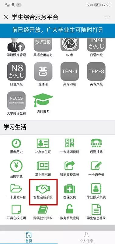 3.选择农行卡代扣方式交费的同学,在本人农行卡扣款成功24小时后,可登录学校微信公众号智慧迎新系统查询交费信息。