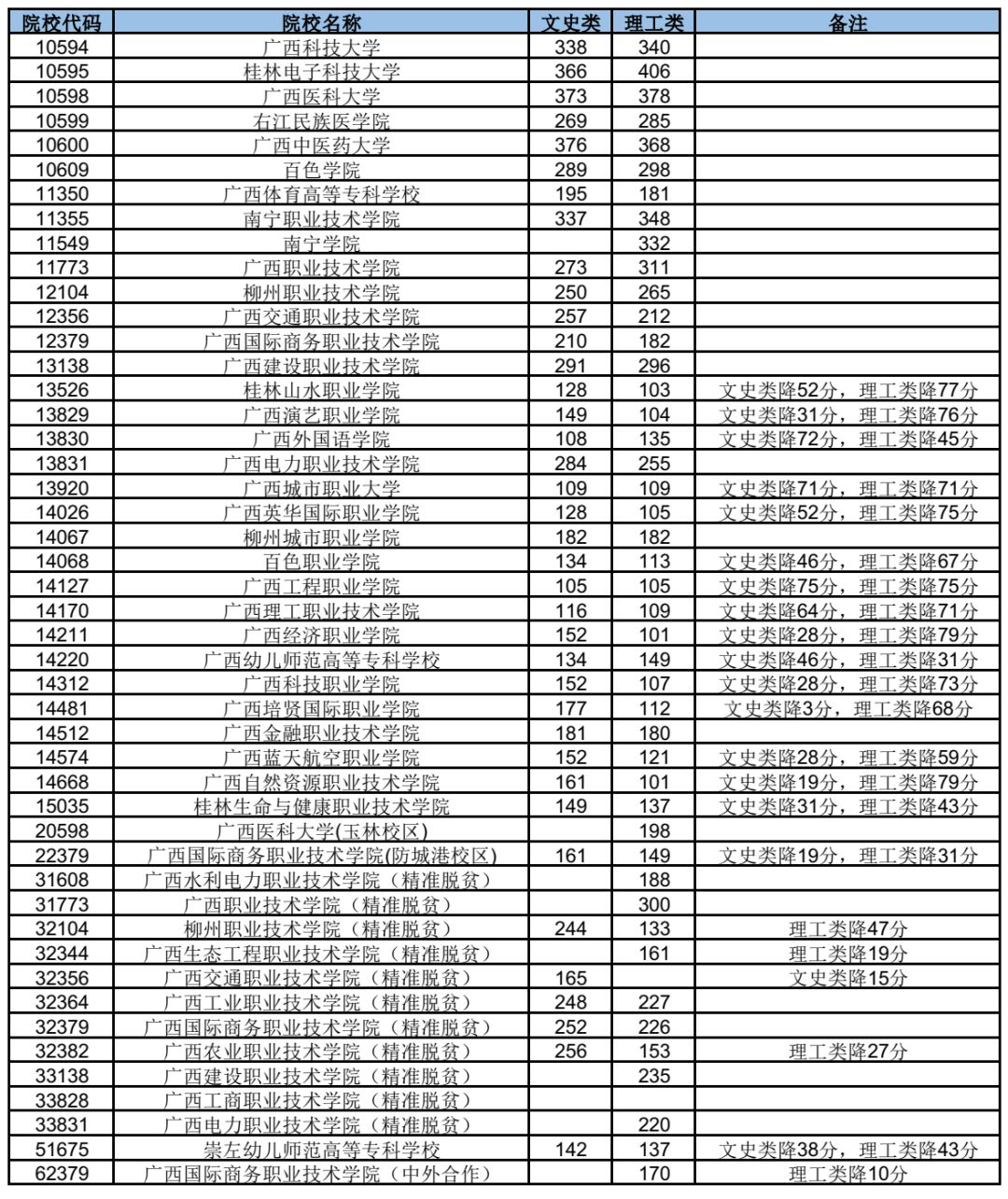 2019年广西普通高校招生高职高专普通批最低投档分数线(第二次征集)