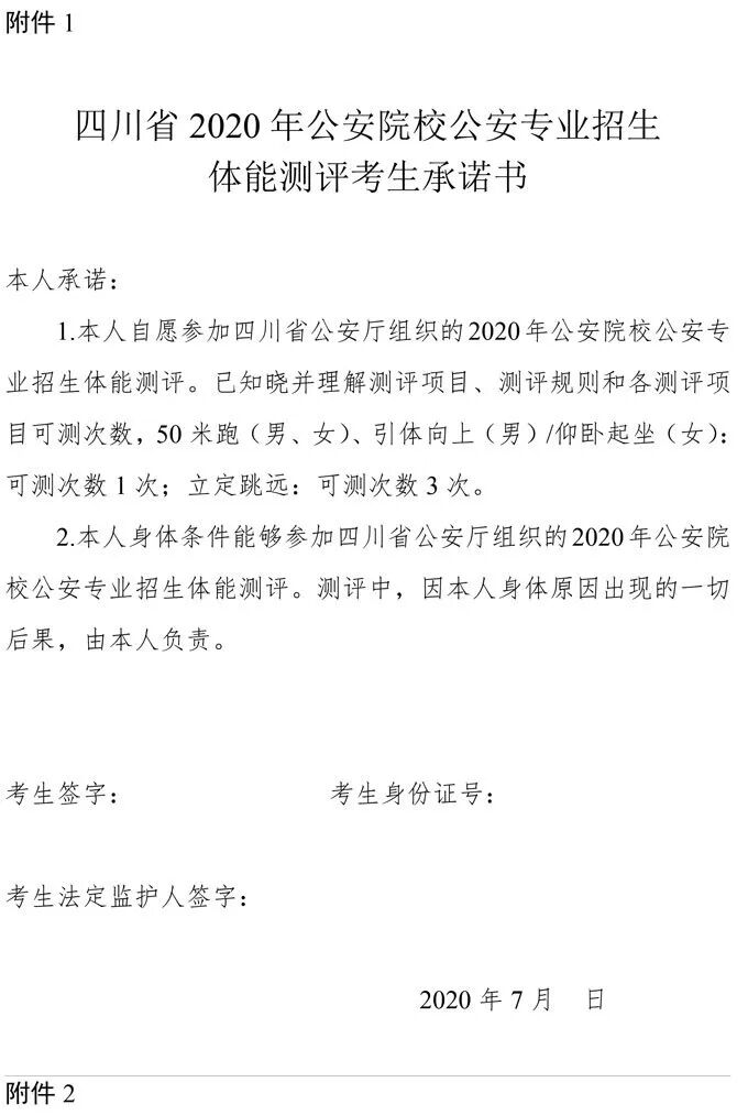 (五)参加面试、体检、体能测评的考生须准确提供本人户籍所在地派出所名称并提交本人和法定监护人共同签字的《四川省2020年公安院校公安专业招生体能测评考生承诺书》(附件1,考生自行下载打印后签字),同时携带准考证、二代身份证、本人户口本复印件(首页和本人所在页)、近期免冠一寸照片3张、本人高考招生体检表(复印件)。
