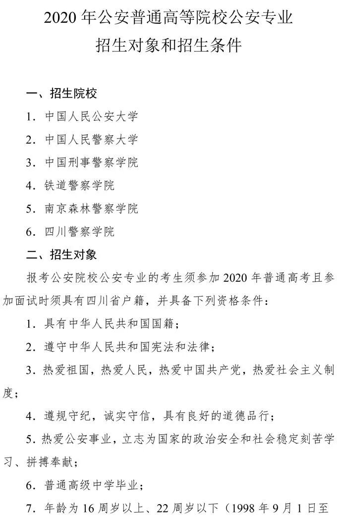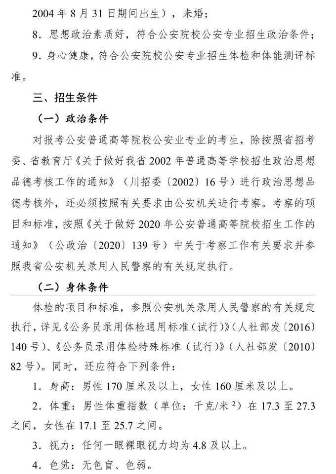 根据教育部、公安部有关要求,为保证招生质量,结合我省实际,特制定四川省2020年公安普通高等院校公安专业招生面试、体检、体能测评和考察工作办法。