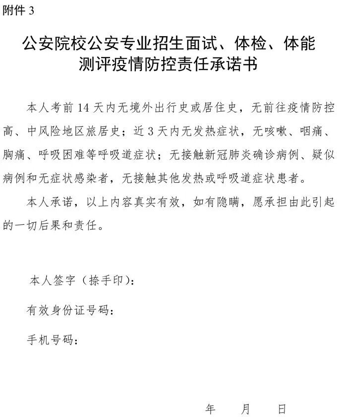 2.2020年公安普通高等院校公安专业招生对象和招生条件3. 2020年公安院校公安专业招生面试、体检、体能测评疫情防控责任承诺书(点击下载: