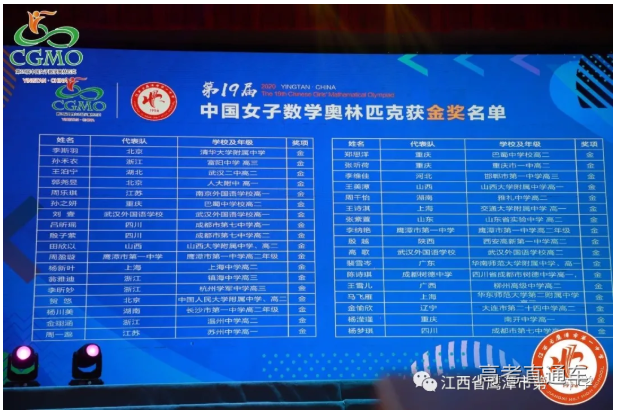 2020年第19届中国女子数学奥林匹克经过4天激烈的角逐,于2020年8月11日在鹰潭市第一中学圆满落幕。本次比赛中,共有35名同学荣获一等奖、55名同学荣获二等奖、30名同学荣获三等奖,其中,个人总分前15名的选手将自动进入数学冬令营。