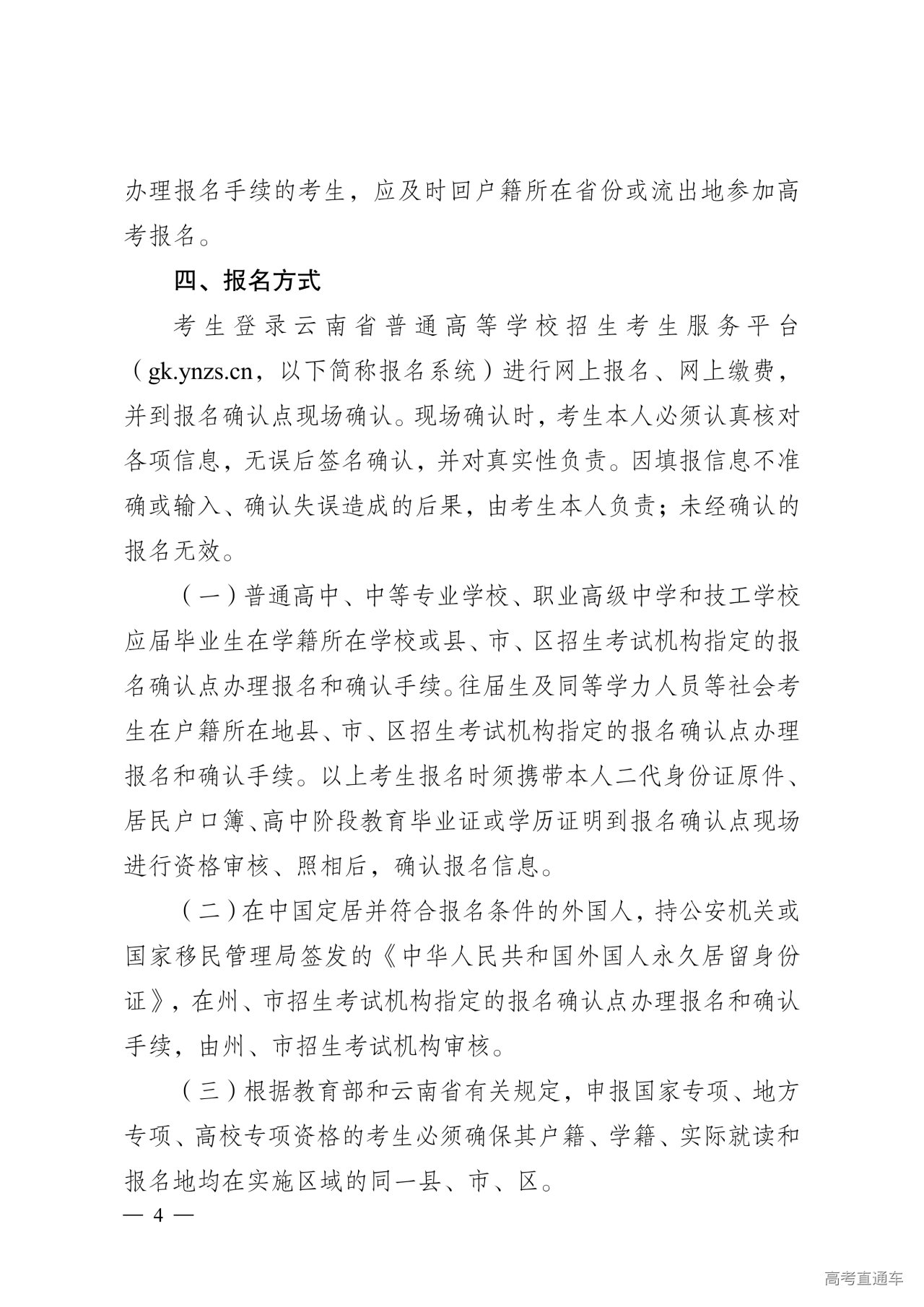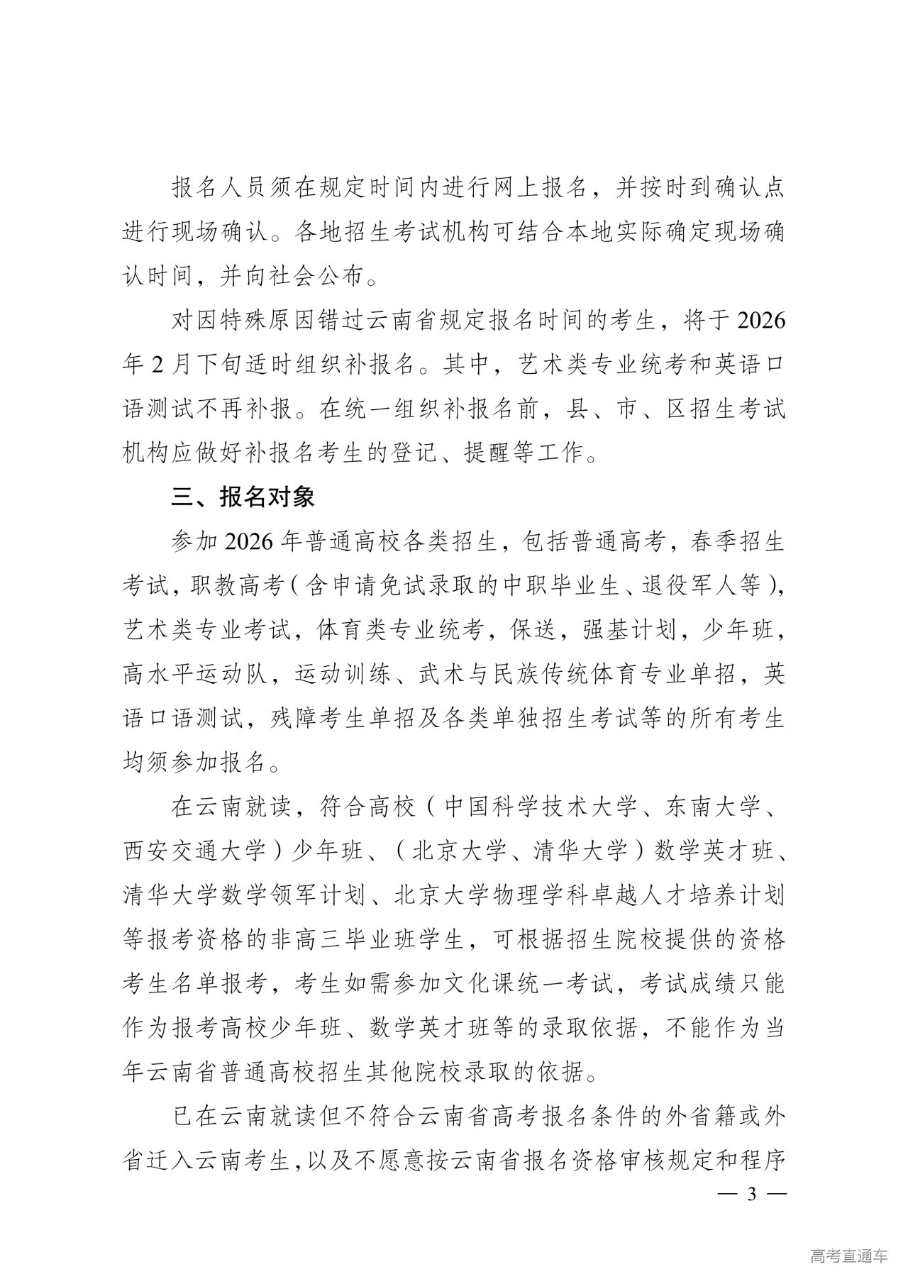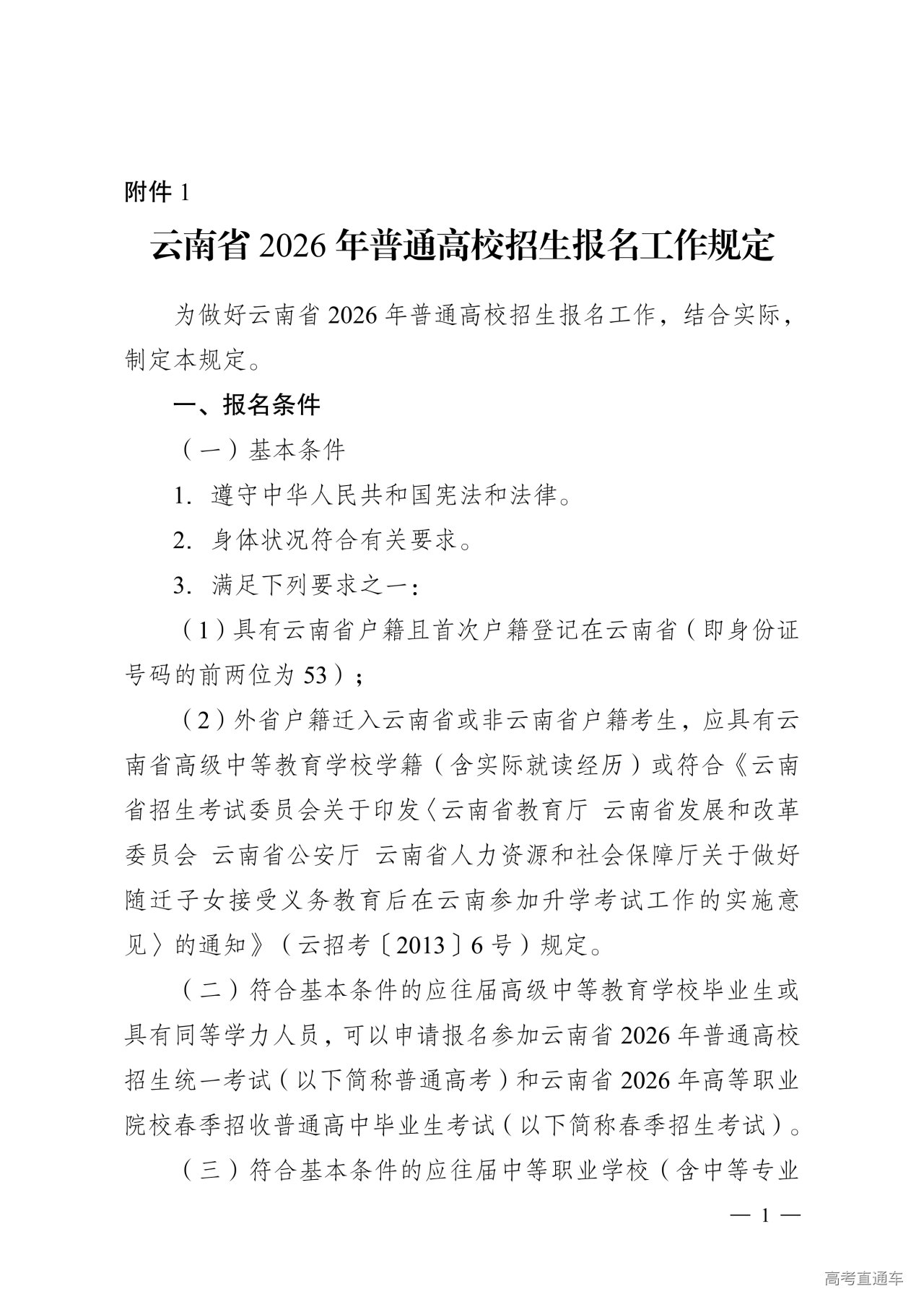 云南省2026年普通高校招生报名(以下简称高考报名)工作按照教育部有关规定和《云南省2026年普通高校招生报名工作规定》(附件1)执行。