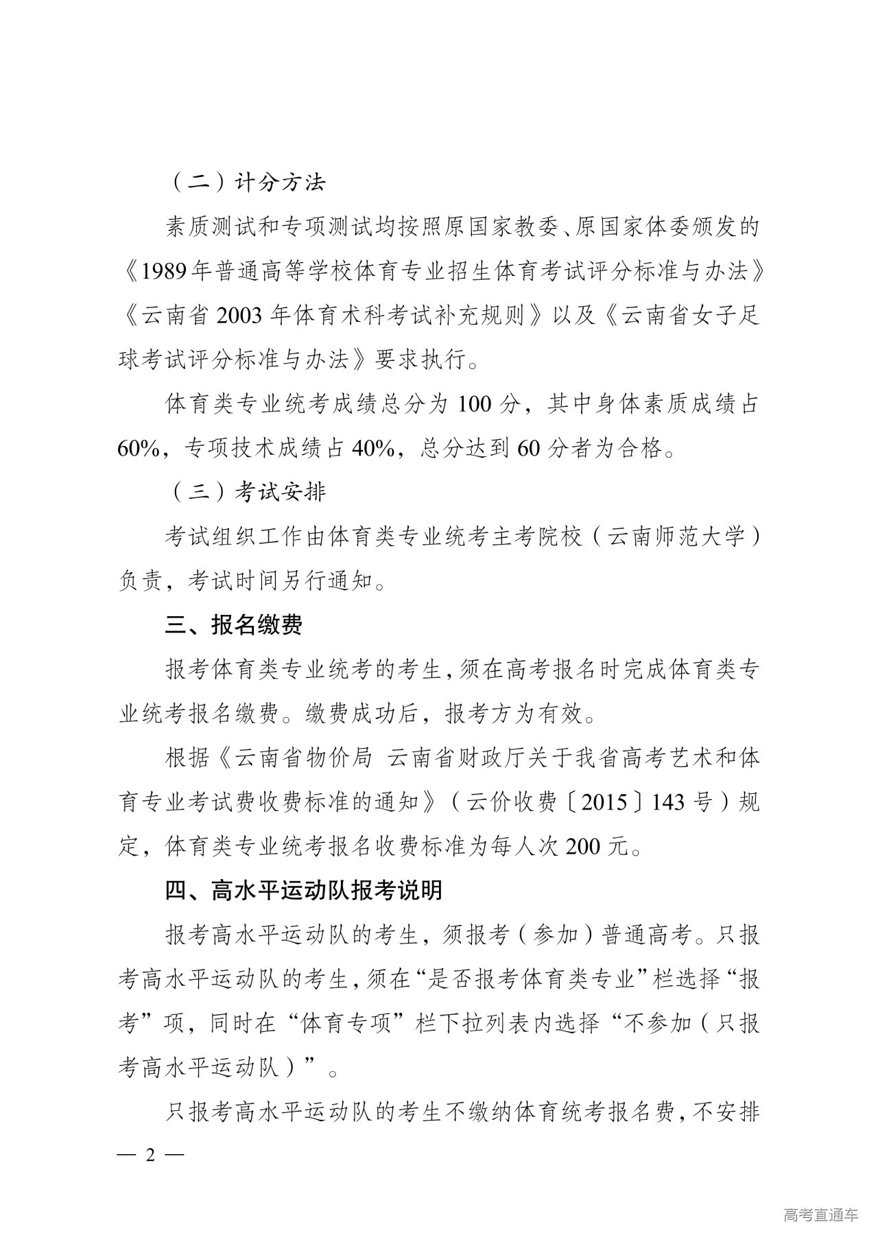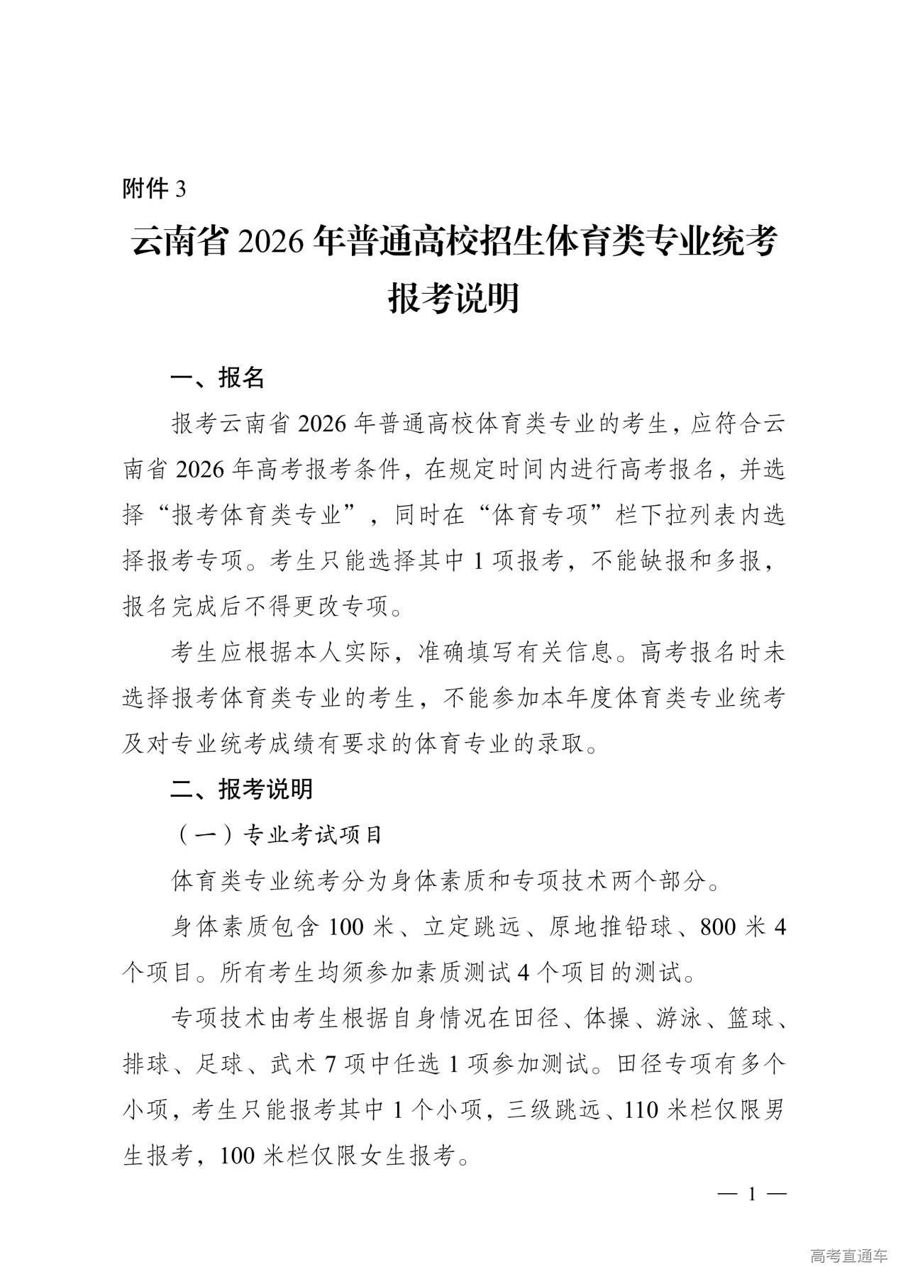 报考体育类专业的普通高考考生,报考春季招生考试体育类的考生和报考职教高考体育类的考生,须根据要求选择参加体育类专业统考,具体报考办法见《云南省2026年普通高校招生体育类专业统考报考说明》(附件3)。