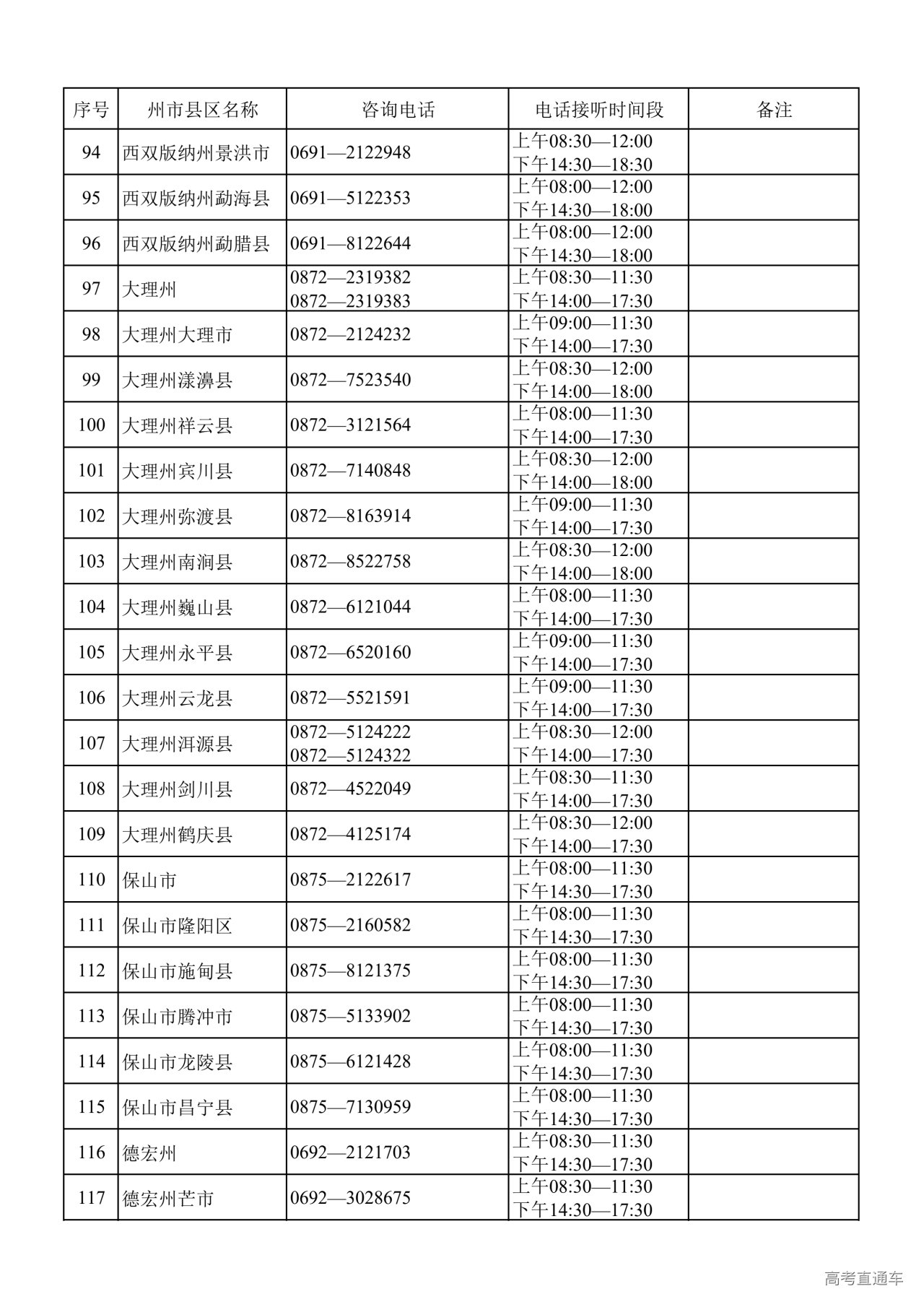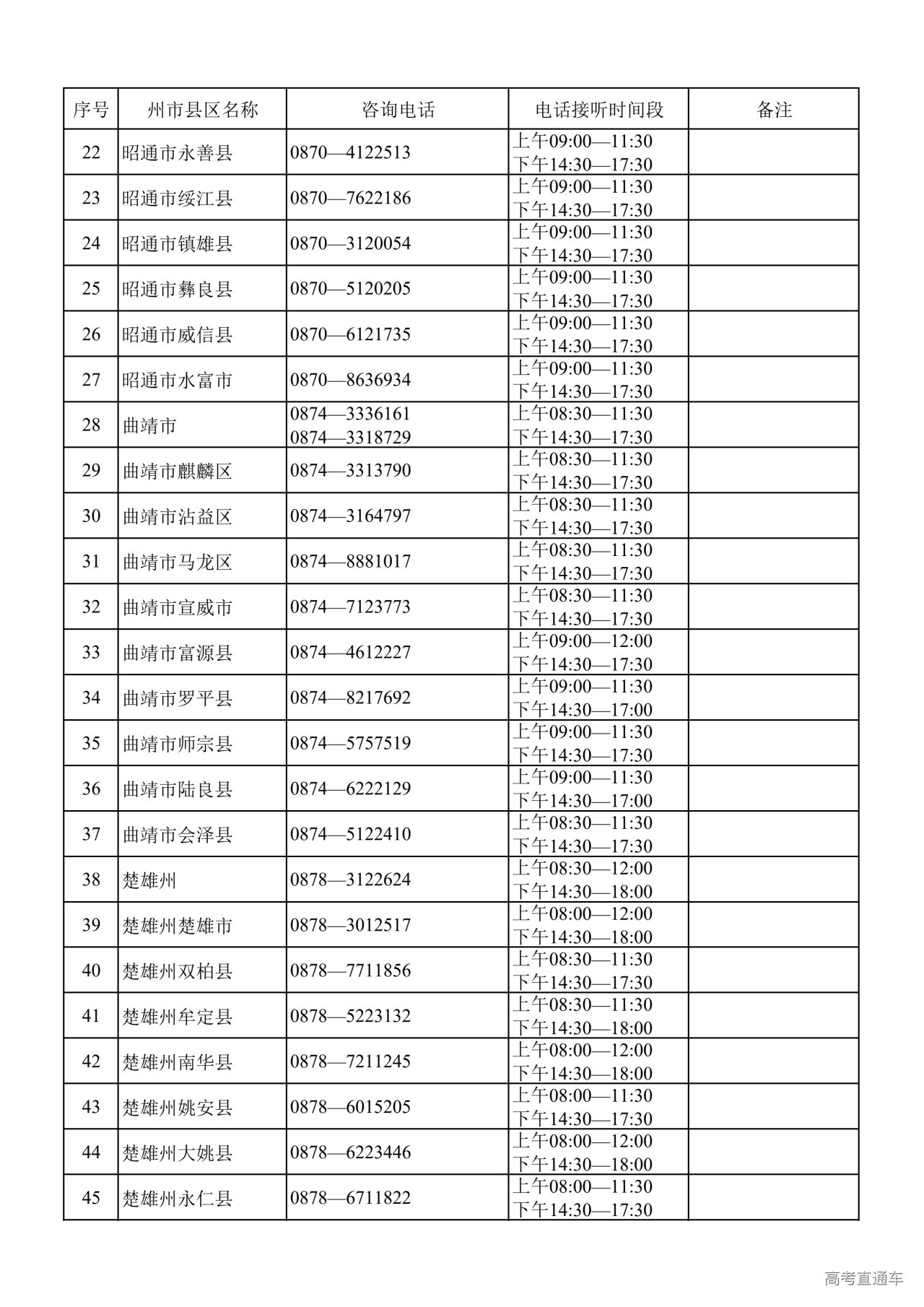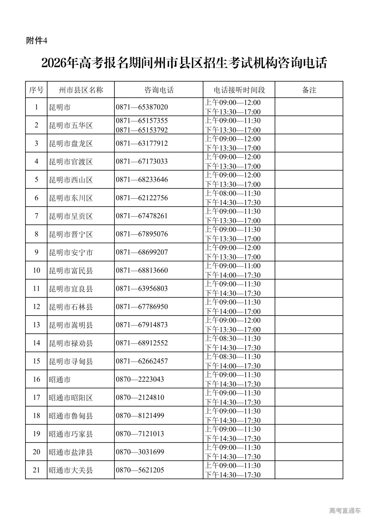 附件4:云南省2026年高考报名期间州市县区招生考试机构咨询电话